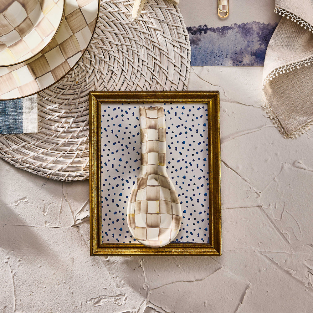 Stir up signature style with our Mocha Check Spoon Rest. This handsomely curved enamel piece, bedecked in hand-painted, coffee-colored checks, always stands by to tidy up the counter. From quick work-night stir-fries to long-simmering weekend stews, this elevated kitchen helper works in style all week long.