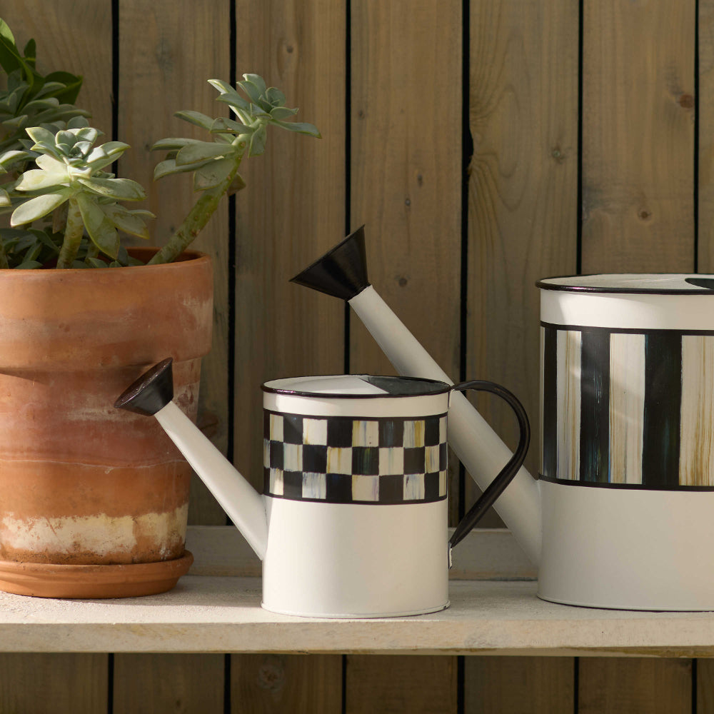 Pamper every plant with a drink from this small white galvanized metal watering can, decorated with Courtly Check® and finished with a black handle.