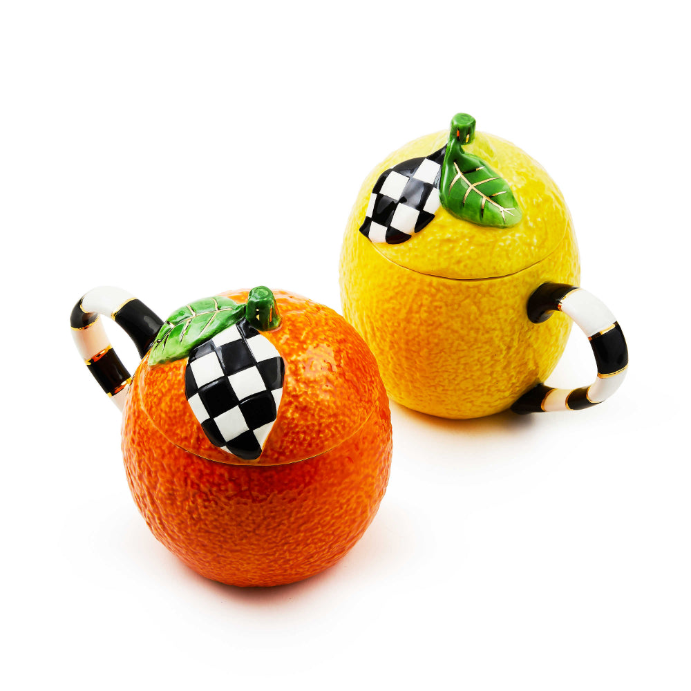 Squeeze the day and serve refreshing drinks in this set of two lidded ceramic mugs that are painted like an orange and lemon and trimmed with gold lustre.