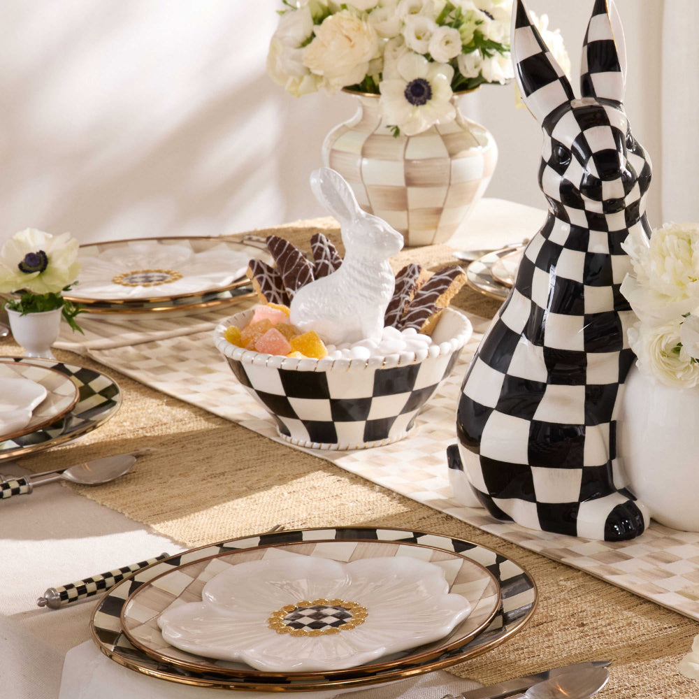 Indulge in the whimsical charm of the MacKenzie-Childs White Rabbit Candy Dish. Made of durable ceramic in a classic black and white color scheme, this adorable dish is not only a decorative piece but also the perfect way to store your favorite sweets.