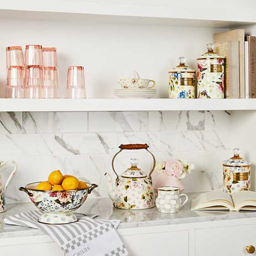 The Green Wildflowers Enamel Large Canister holds just about everything. Keep it in the kitchen with baking staples or invent new uses around the house. Perfect for cotton balls in the bathroom, pens and pencils in the office, or knickknacks and doodads in the kids’ room. Color glazed in white, each Wildflowers canister is decorated with hand-applied floral transfers on green splots, topped with a clear glass knob. These canisters stand handsomely alone or harmonize delightfully in a multicolor Wildflowers set.
