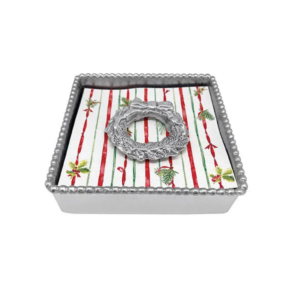A festive wreath shines in splendor as a striking Napkin Weight in this popular set. Set includes weight, stack of festive cocktail napkins, and a Beaded Napkin Box. Handcrafted from 100% recycled aluminum.