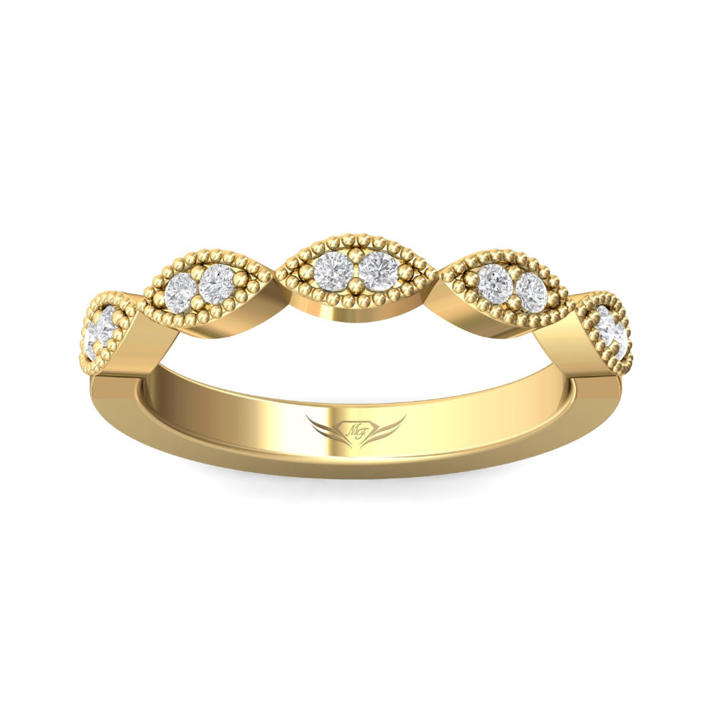 Fun is what comes to mind when viewing this unique FlyerFit round bead set diamond in a marquise frame milgrained-edge wedding band. The endless sparkle of this refined style is perfect as a Stacker ring.
