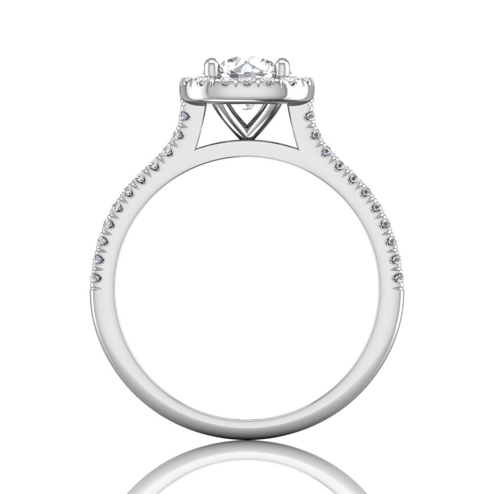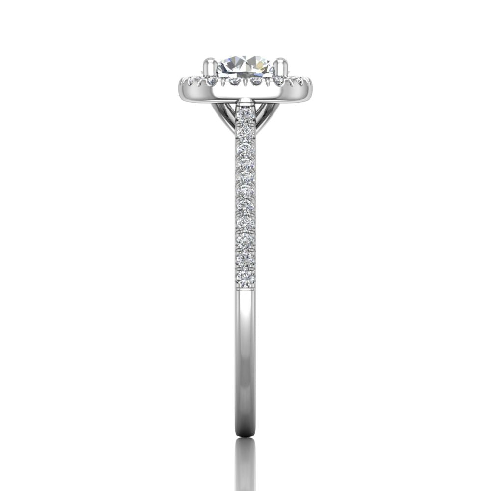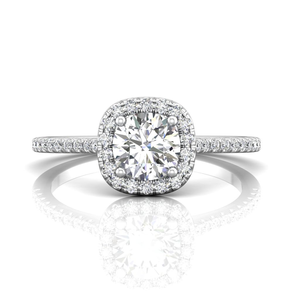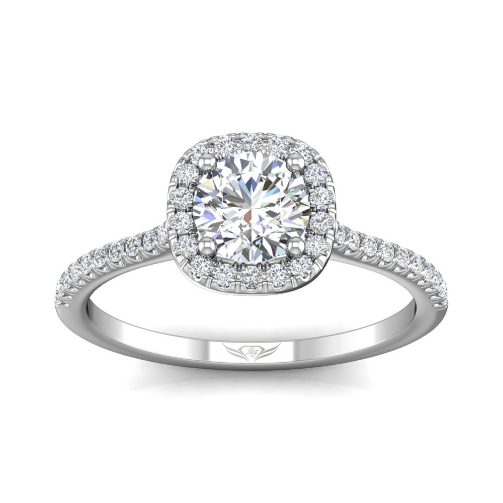 Classically elegant and timeless in design, this FlyerFit halo engagement ring sparkles from the cutdown micropavé diamonds adorning the band as well as the cushion halo and round center diamond.