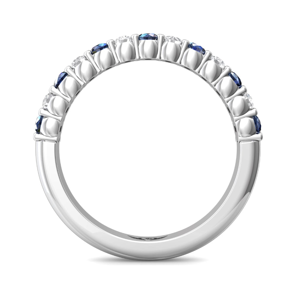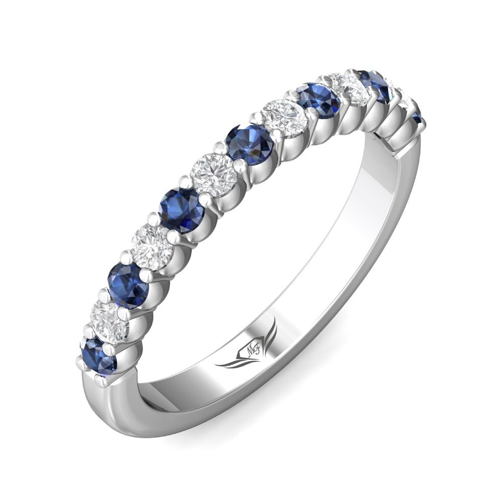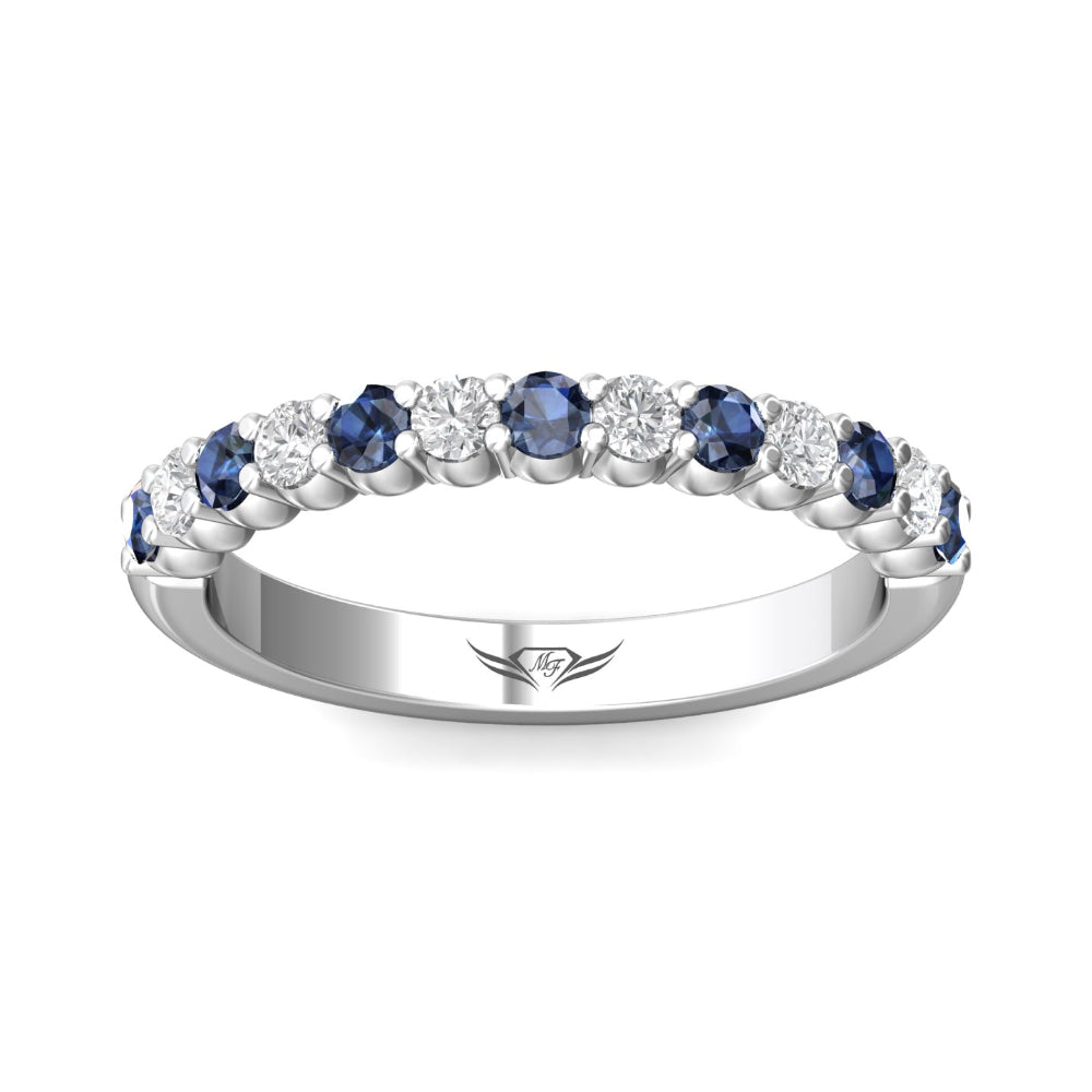 Simply subtle and lovely artistry showcasing blue sapphires and diamonds in a half eternity band. The white gold enhances the beauty of the stones intriguingly.