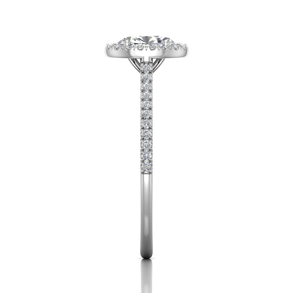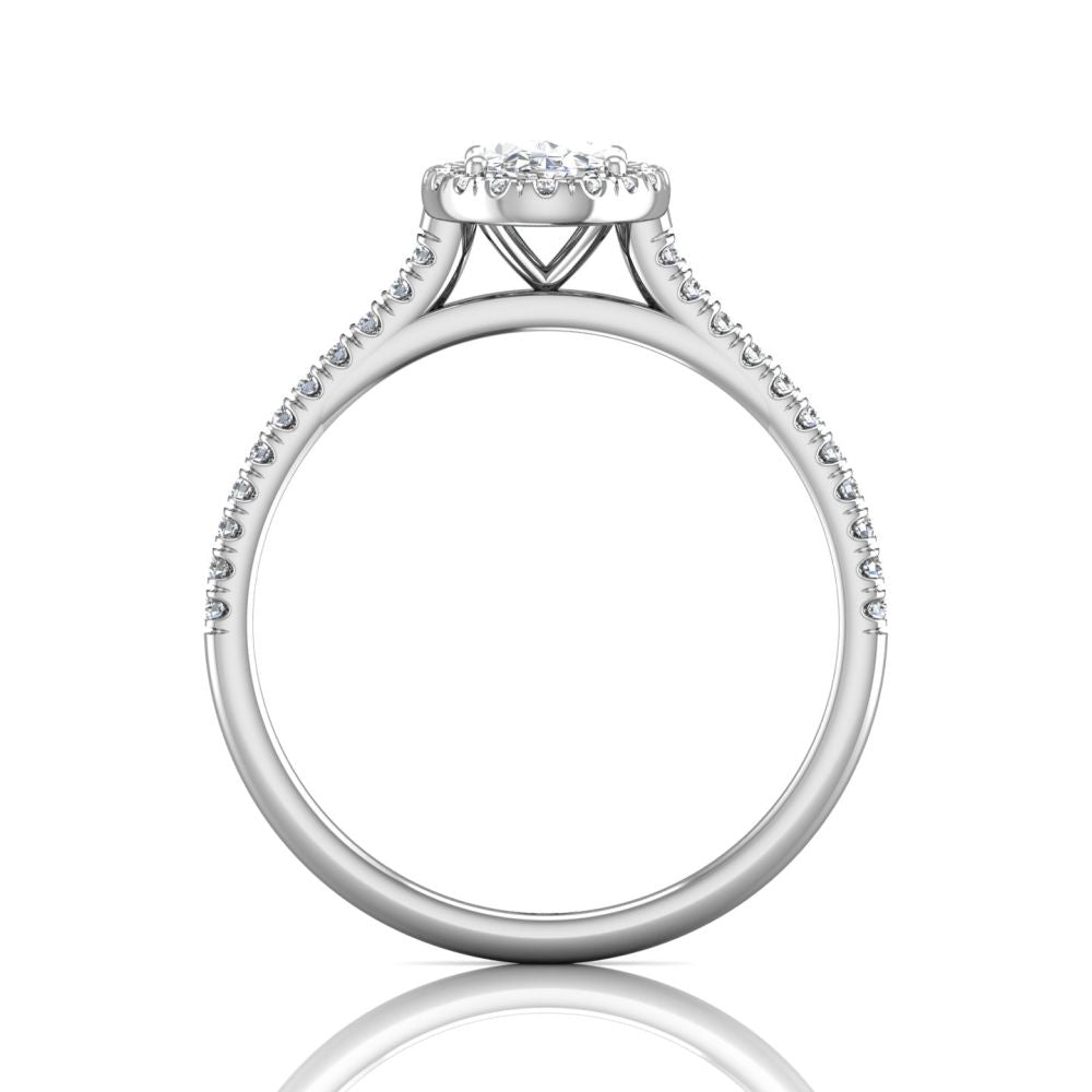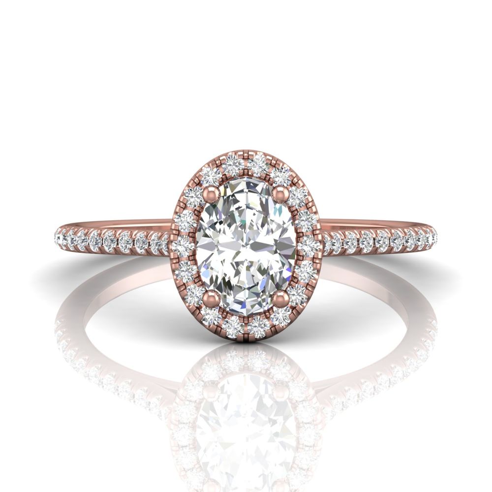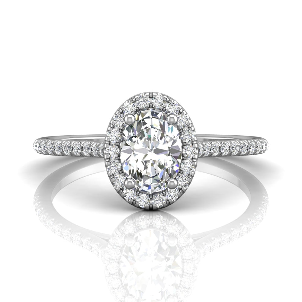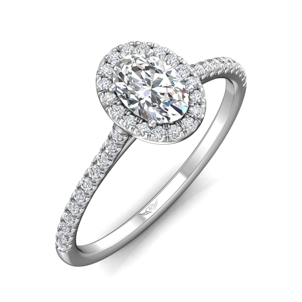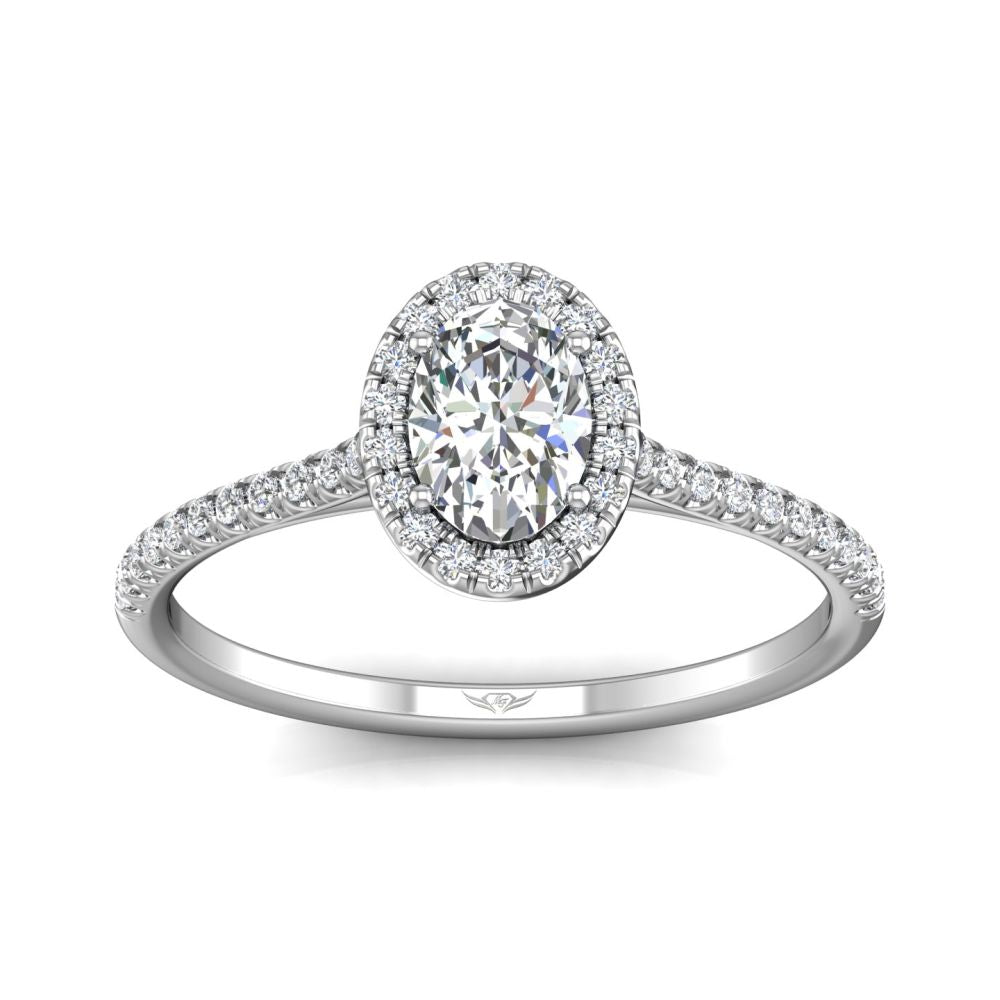 This FlyerFit engagement ring is impeccably concocted with a scintillating halo of brilliant diamonds and an enthralling OVAL-cut center stone. The vivacity of diamonds collectively mirrors throughout the design, resulting in an extraordinary display of brilliance.