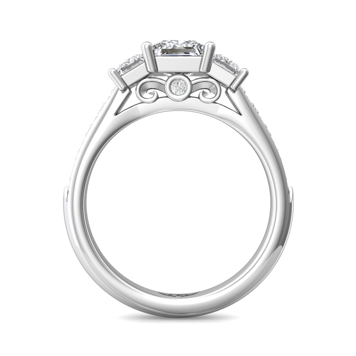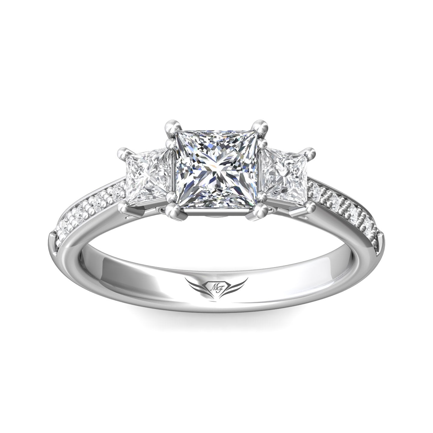 An elegantly designed classic three stone rings meets a stunning FlyerFit princess cut engagement ring.