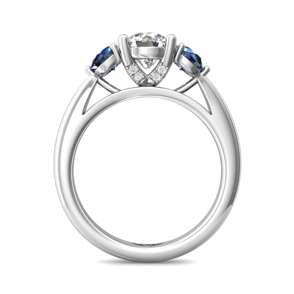 A luxurious FlyerFit engagement ring that features royal blue sapphire side stones with delicate diamond details underneath the head that come together to enhance the center diamond of your choice.