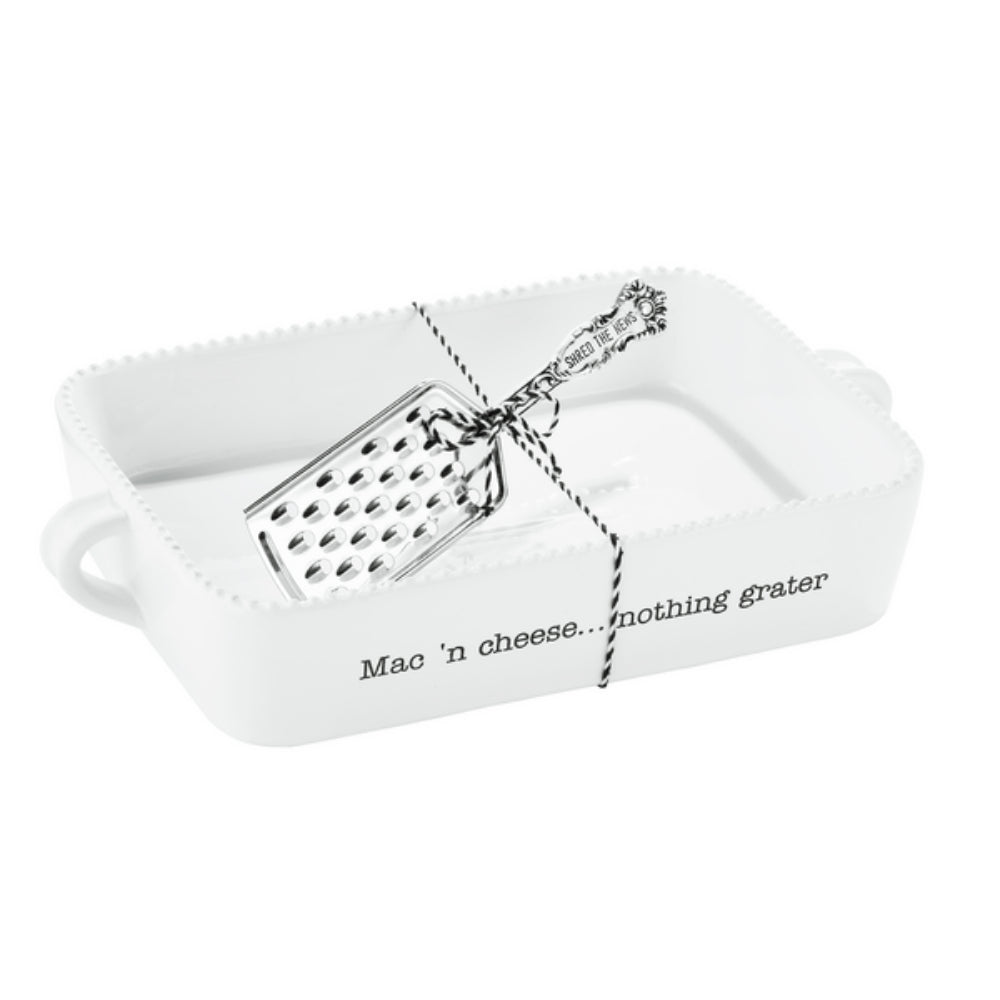 2 piece set, Ceramic mac and cheese baker with side handles arrives tied with silverplate sentiment cheese grater.