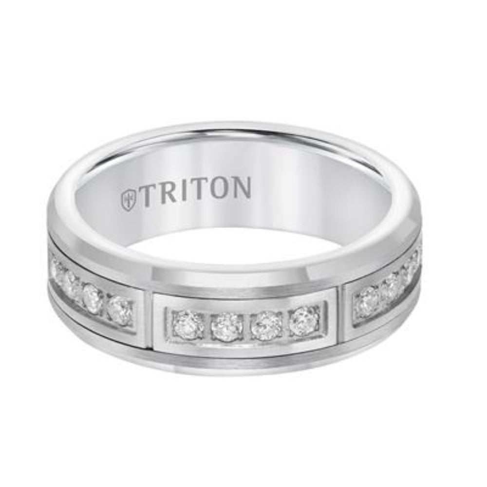 7mm Comfort Fit White Tungsten Band with Channel Set Diamonds in Steel.