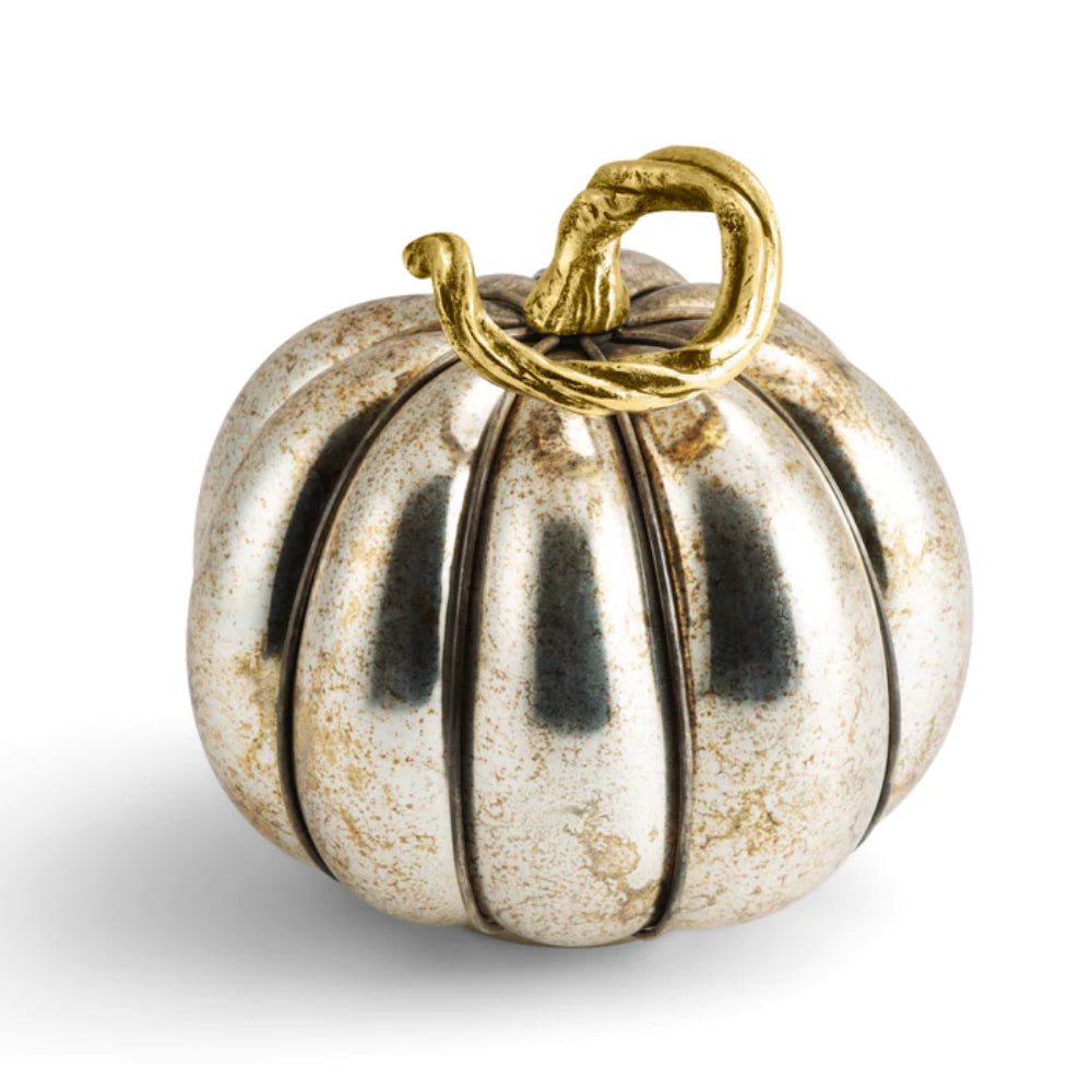 “Halloween is my kids’ favorite holiday and what delight to bring out these pumpkins as a sign of the season! I love their shimmer of contrasting metals and mercury glass. The vibrant colors of fall make it my favorite season, and I like keeping these on display all the way through Thanksgiving.”