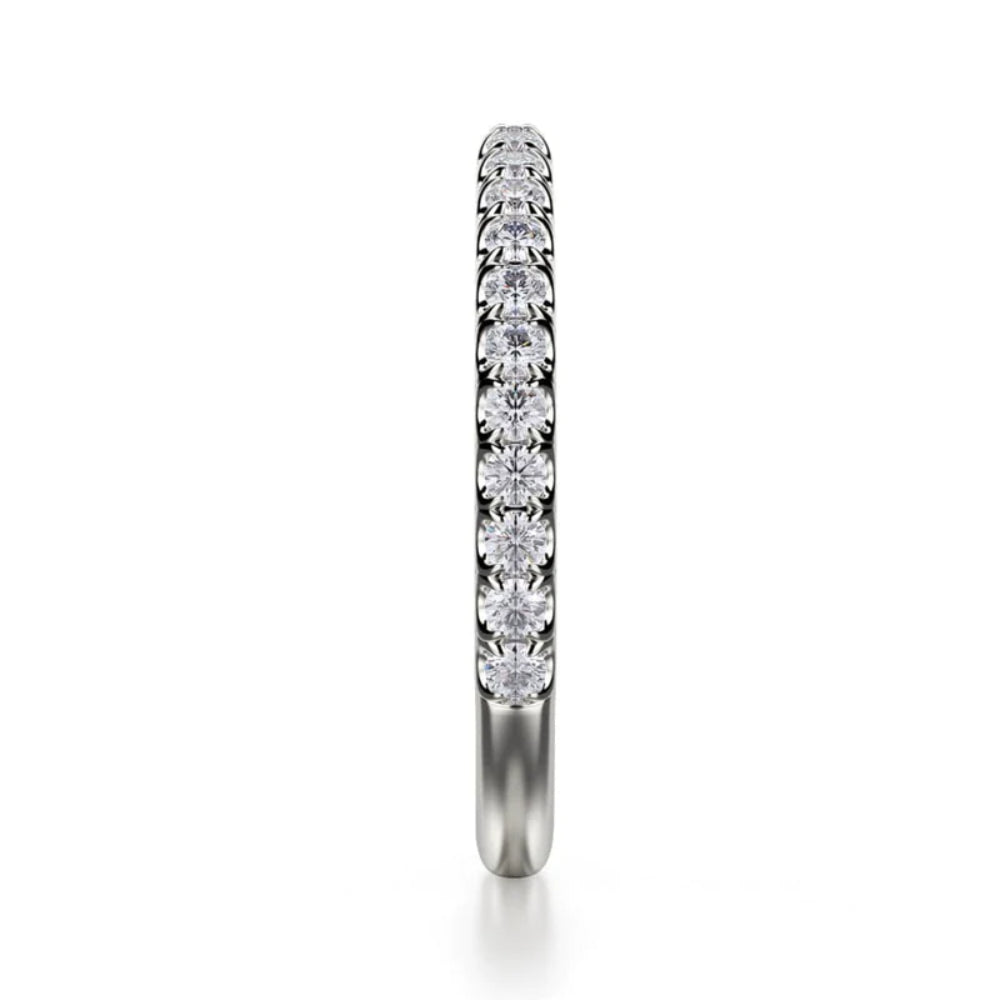 This Michael M ladies' wedding band is adorned with brilliant round-shaped pave set diamonds, and are placed in a beautiful 3/4 way ring style. Crafted by the jewelry masters of Michael M, this wedding band is made using exquisite 18-karat white gold, breathtaking with a peerless gleam and glow. Long-lasting and resistant to tarnish, white gold makes for the perfect metal in accentuating the brilliant diamonds that adorn this piece.