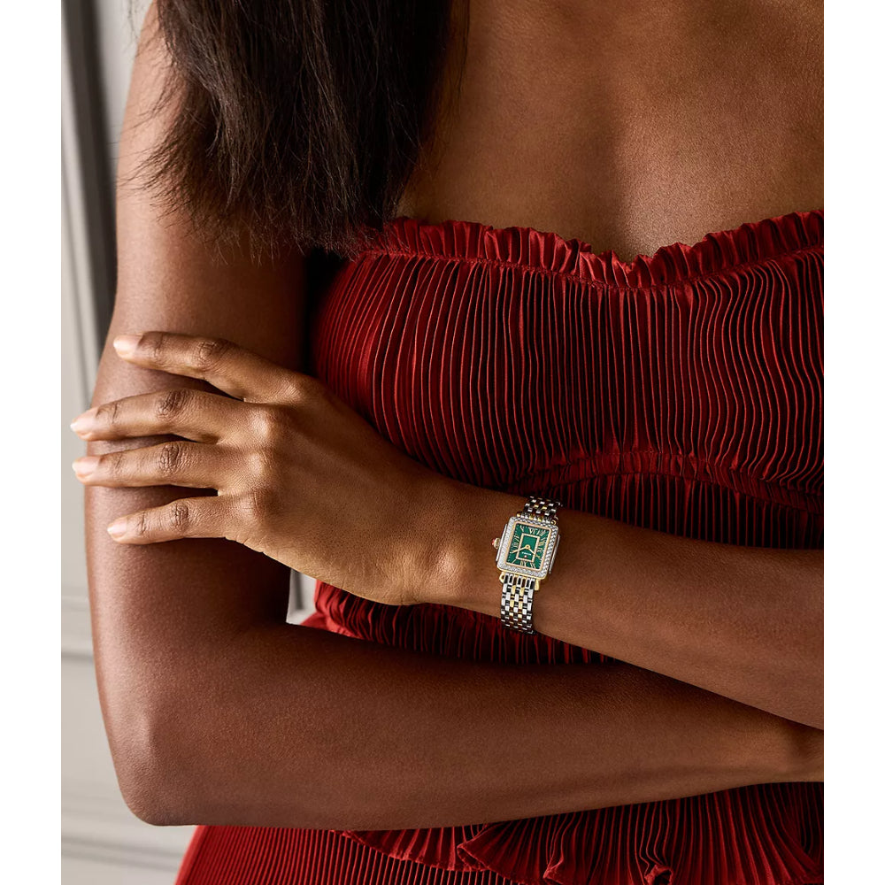 This petite stainless steel and 18K gold-plated timepiece perfectly balances vintage-inspired style with a modern edge. The lush green mother-of-pearl dial shines with glossy roman numerals while 122 total diamonds accent the dial and bezel (0.43 carat weight) of this luxurious style with a Swiss movement. The stainless steel and 18K gold-plated seven link bracelet is made specifically for the Deco Madison Mini collection and is interchangeable with any 12mm MICHELE strap.