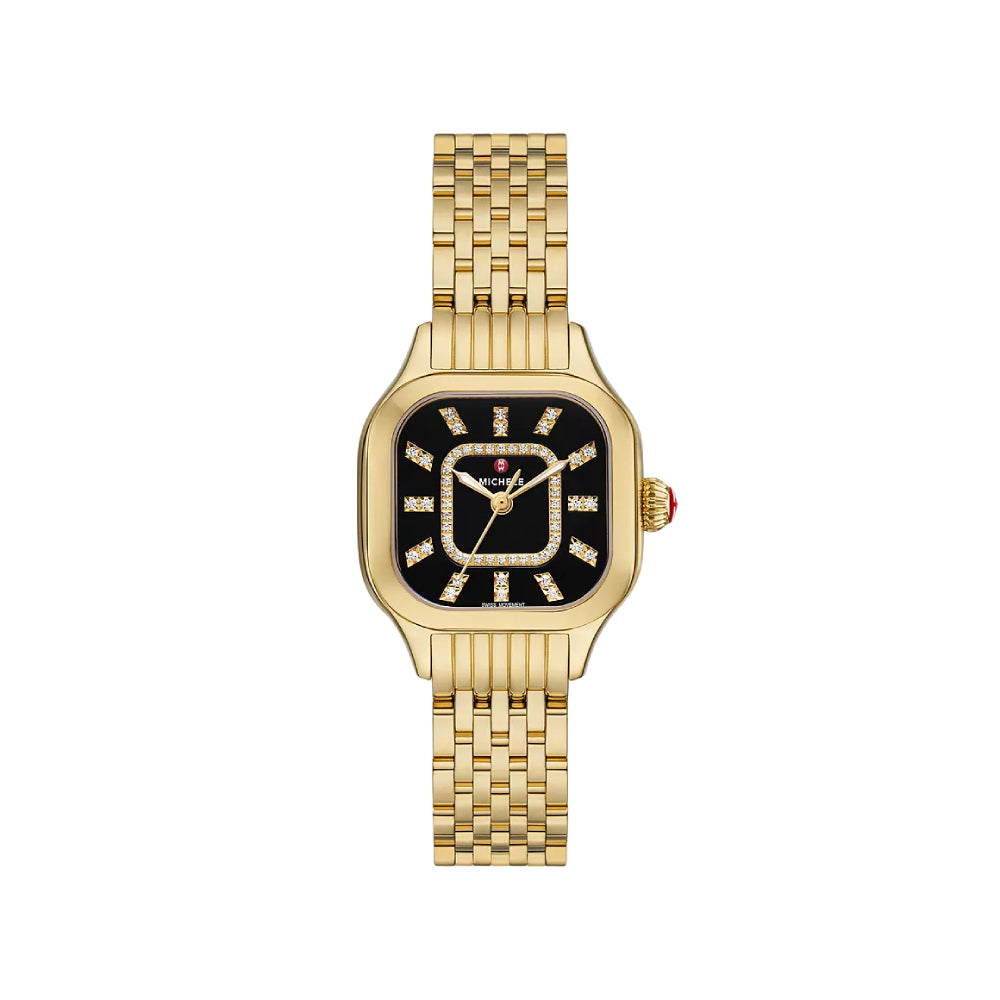 Elegant curves add modern elegance to the case of MICHELE's stunning Meggie watch that sparkles with 60 hand-set diamonds (0.19 carat weight) and a noir gloss dial with diamond inner ring and signature double diamond indexes. This watch features a Swiss movement and a gleaming 14mm 18K gold-plated seven-link bracelet made specifically for the Meggie collection interchangeable with any 14mm MICHELE strap.