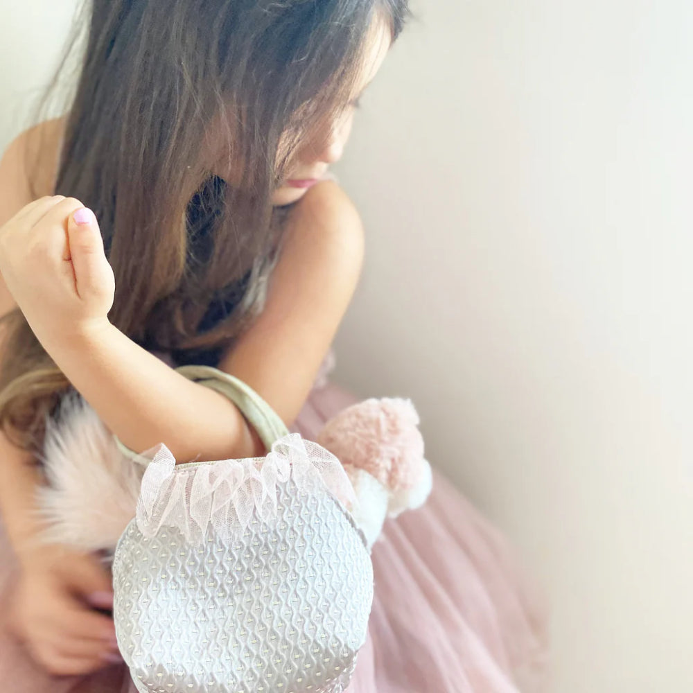 Tote around your pet bestie in their very own pretty toy purse! A mini sized Callie the kitty in a beautiful novels satin bag, trimmed in soft pink tulle and gold handle.