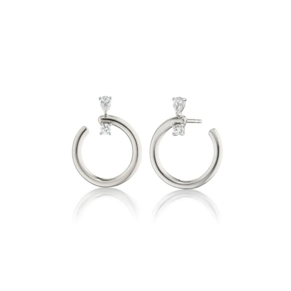 These galaxy inspired wrap hoop earrings begin on your ear with beautifully cut round and pear shaped white sapphires. The 11/16" sterling silver hoop then wraps gently from front to back hugging just behind the ear. They are designed to be timeless, luxury styles you will love to wear again and again.
