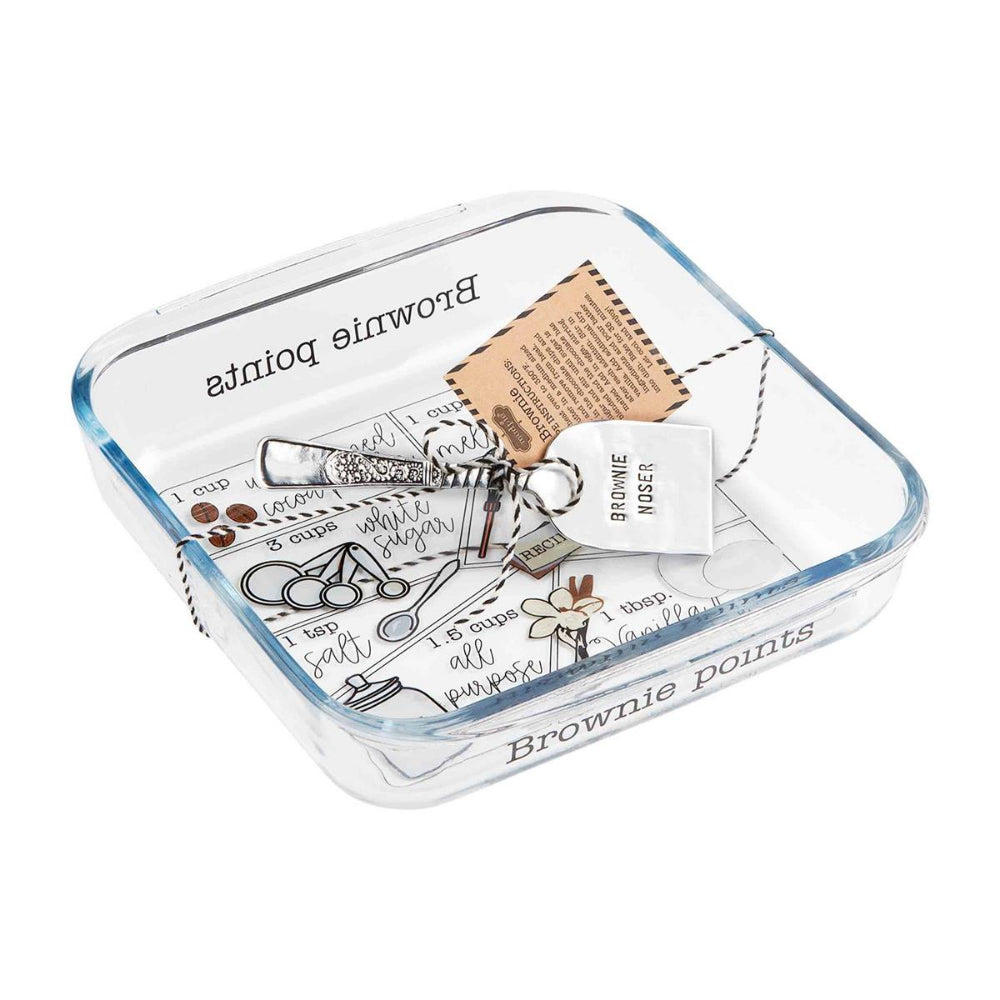 2-piece set. Glass brownie recipe guide baking dish. Comes with silverplate spatula.