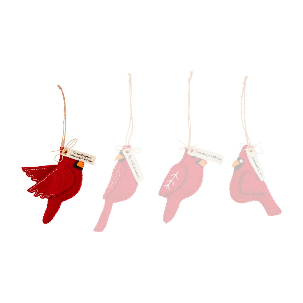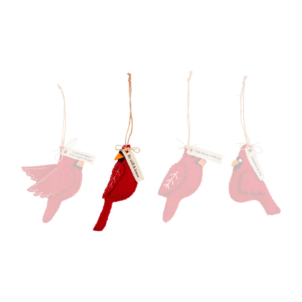 Stuffed felt cardinal ornament with canvas sentiment tag and jute twine hanger, comes in 4 styles