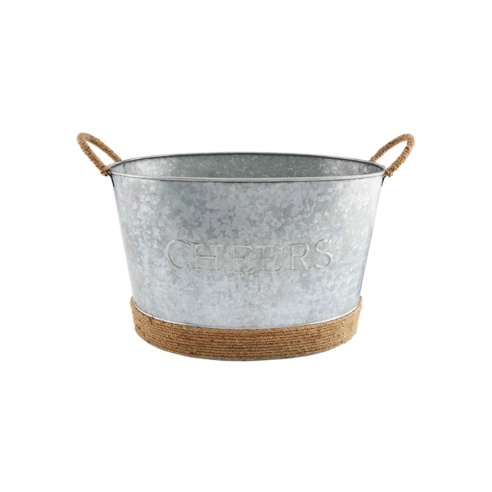 Say cheers to the weekend with our Cheers Party tub. The embossed tin party tub features a jute rope wrapped base. The tin party tub features jute handles. The front of the tub features the words "Cheers". This tub is perfect for outdoor entertaining and perfect for storing drinks!