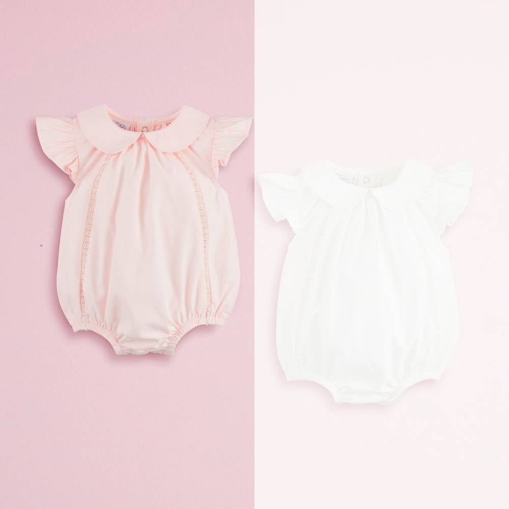 Poplin bubble features Peter Pan collar and circle eyelet trim. Inner leg snaps.