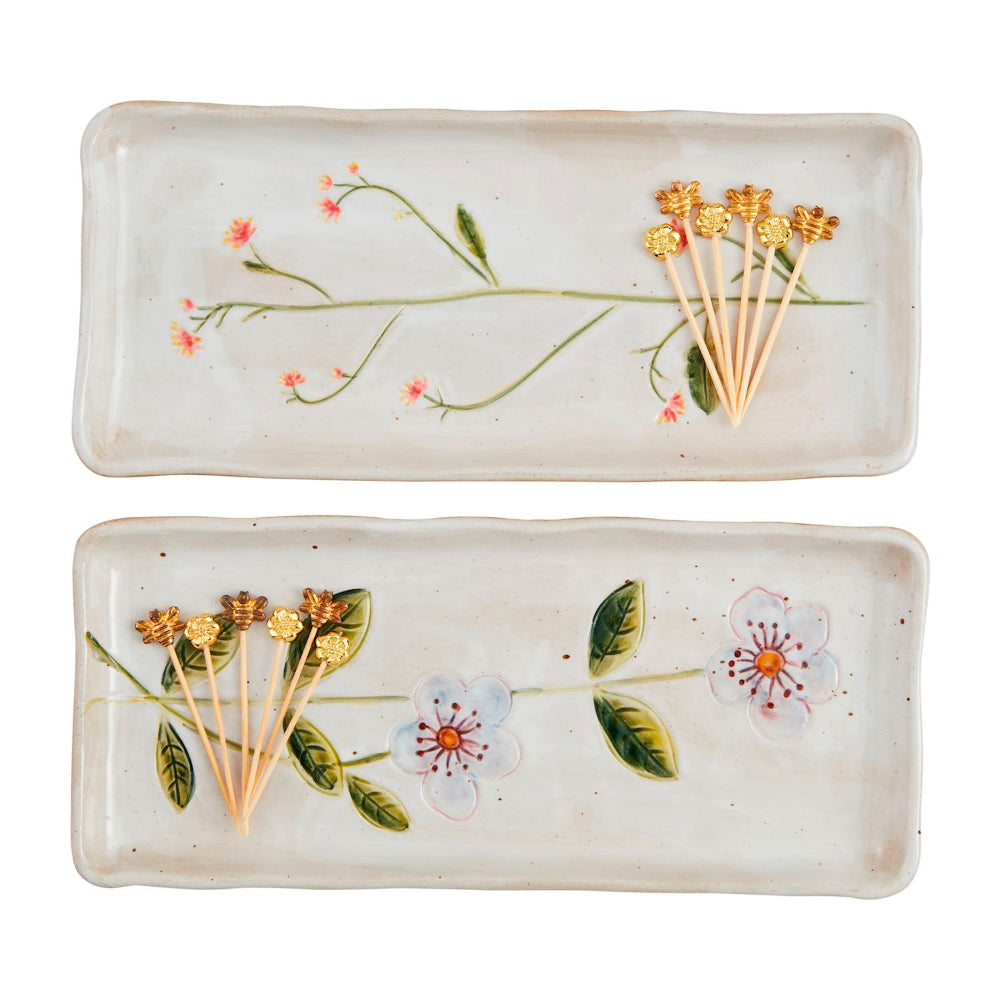 Hand-painted stoneware tray comes with pack of metal character topped toothpicks.