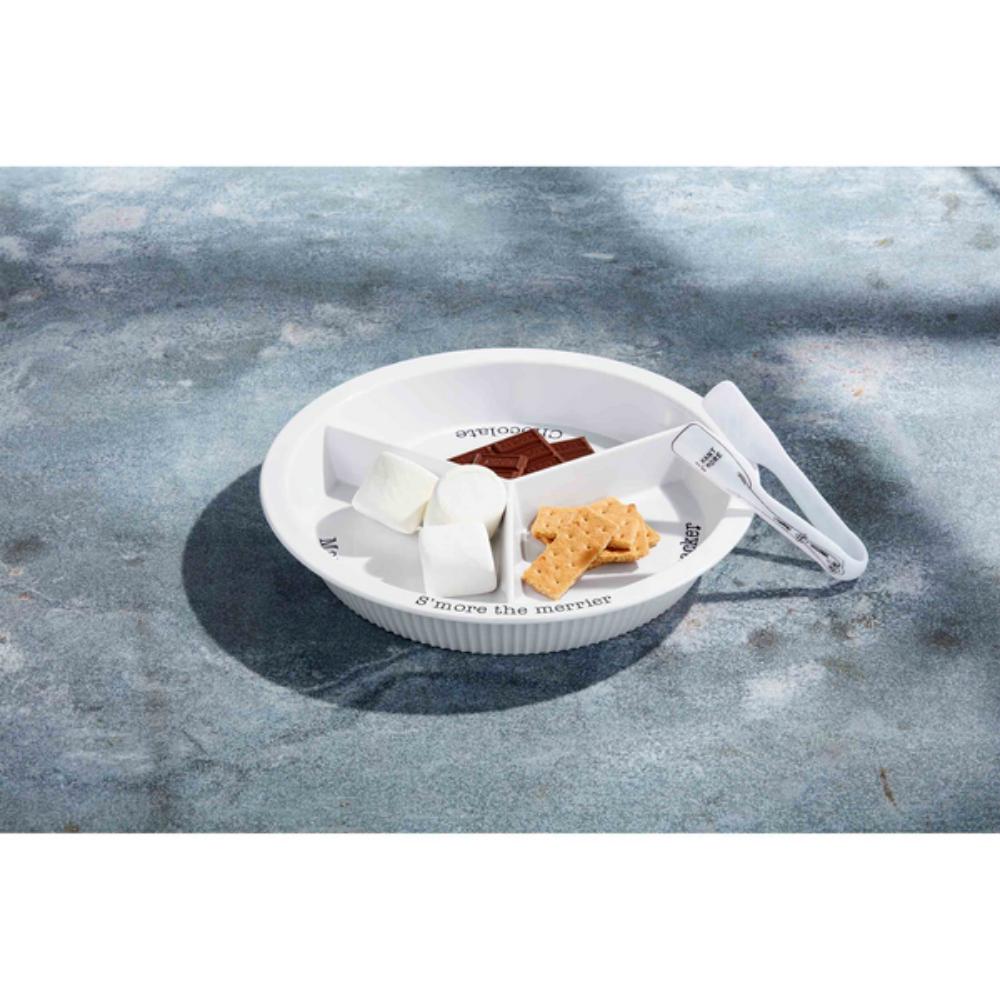 We think the s'more the merrier when it comes to this Outdoor S'more Tray Set. The two piece set comes with a fluted melamine three-section s'more server. The server features sections for marshmallows, chocolate and graham crackers. The dish comes with silver tongs.