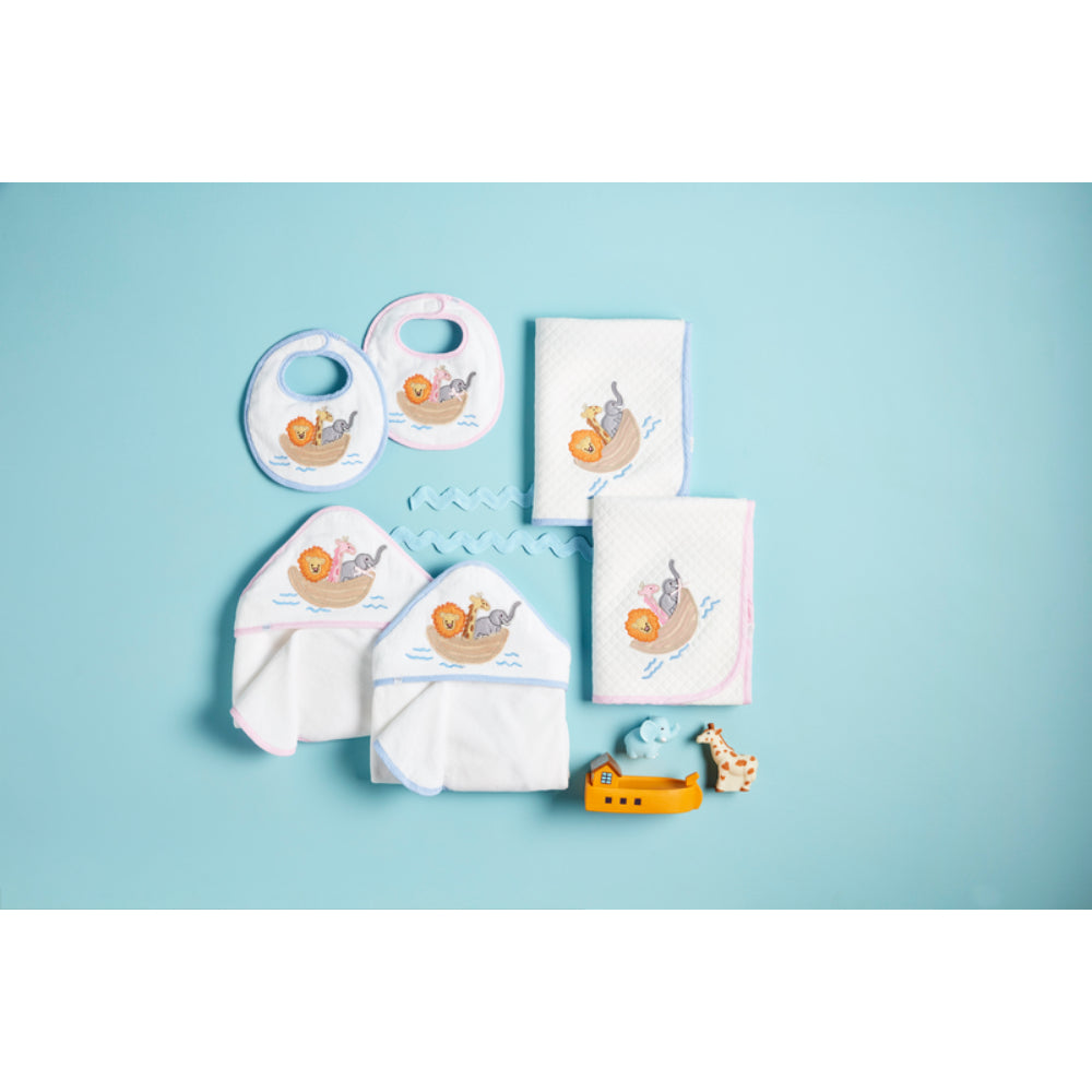 The Pink Noah's Ark Hooded Towel is a delightful and cozy addition to your child's bath time routine. Crafted from soft and absorbent velour terry cloth, this towel ensures a gentle touch on delicate skin while effectively drying your little one. The charming appliqué design features a whimsical Noah's Ark theme, adding a playful and imaginative element to bath time. The hooded design provides extra warmth and comfort, making it perfect for wrapping up your child after a bath or swim. The contrast gingham trim adds a touch of classic style, enhancing the overall aesthetic of the towel. Measuring 30" x 30", it is perfectly sized for infants and toddlers, offering ample coverage and coziness. Made from 100% cotton, this towel is not only soft and gentle but also durable and easy to care for, ensuring it remains a favorite for years to come.