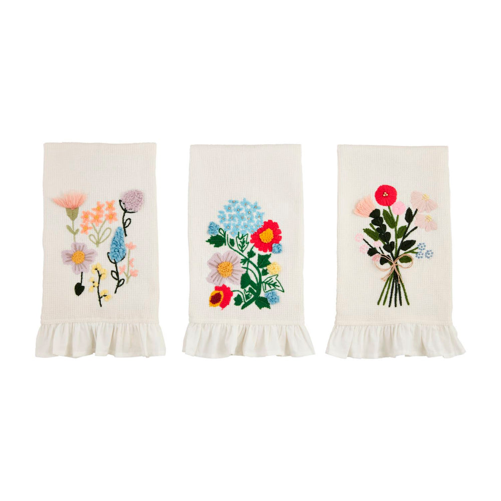 Embroidered waffle weave hand towel with cotton ruffle hem.