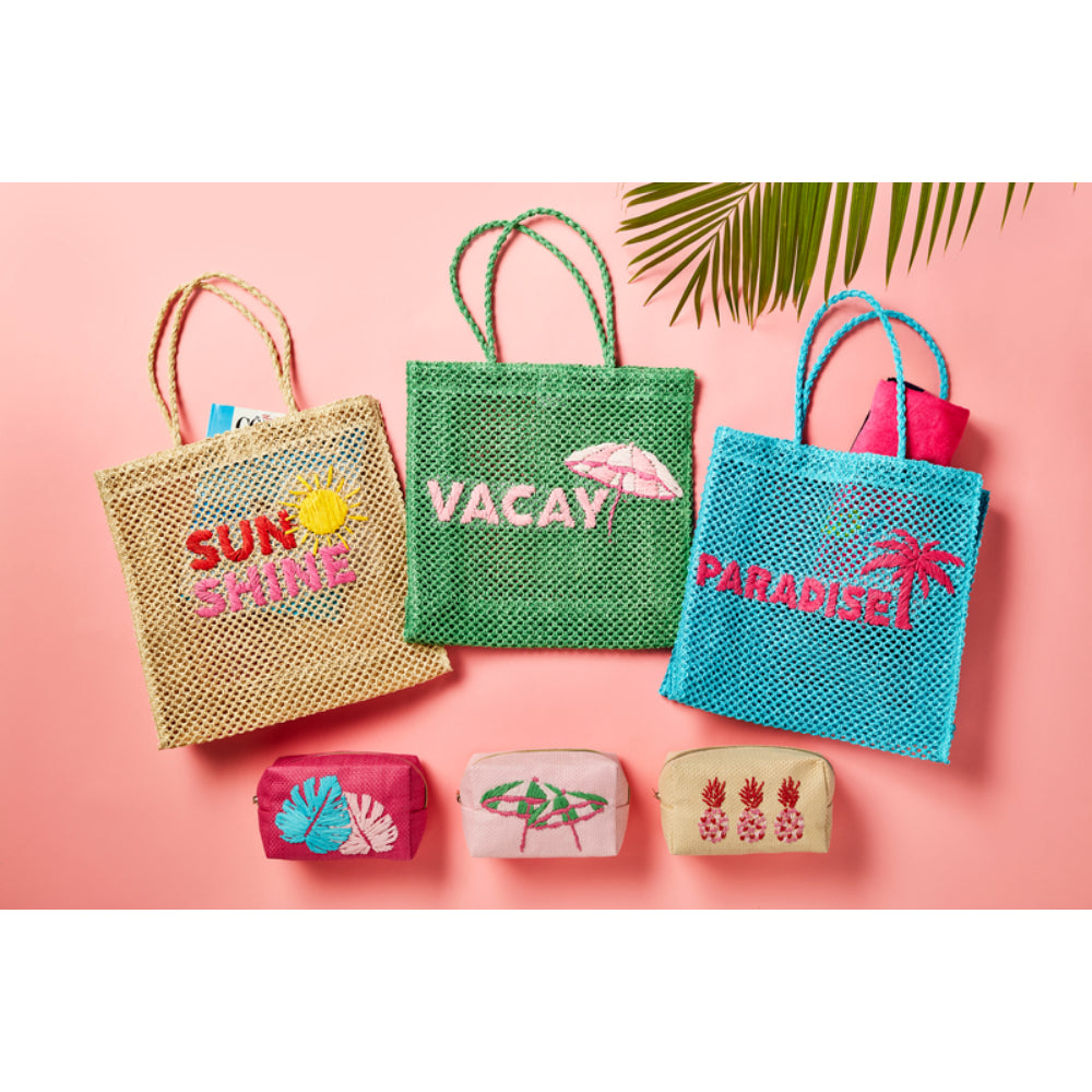 Woven paper straw beach tote features hand applied verbiage and icon and includes an interior magnetic snap closure.