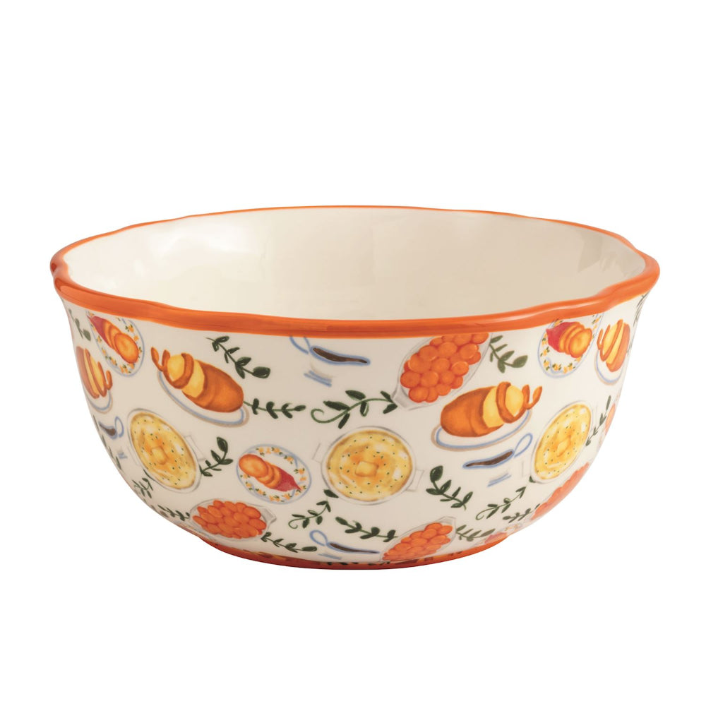 2-piece set. Ceramic serving bowl features hand-painted rim and base. Comes with metal potato masher with wooden handle.