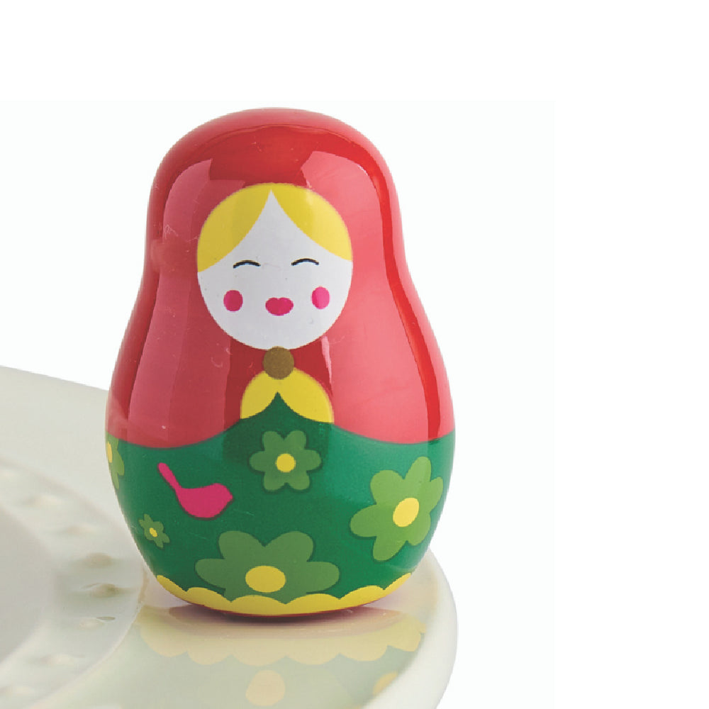This adorable nesting doll is so sweet and a wonderful ode to the traditional Russian nesting dolls. Her outfit features the signature Nora Fleming pink logo.