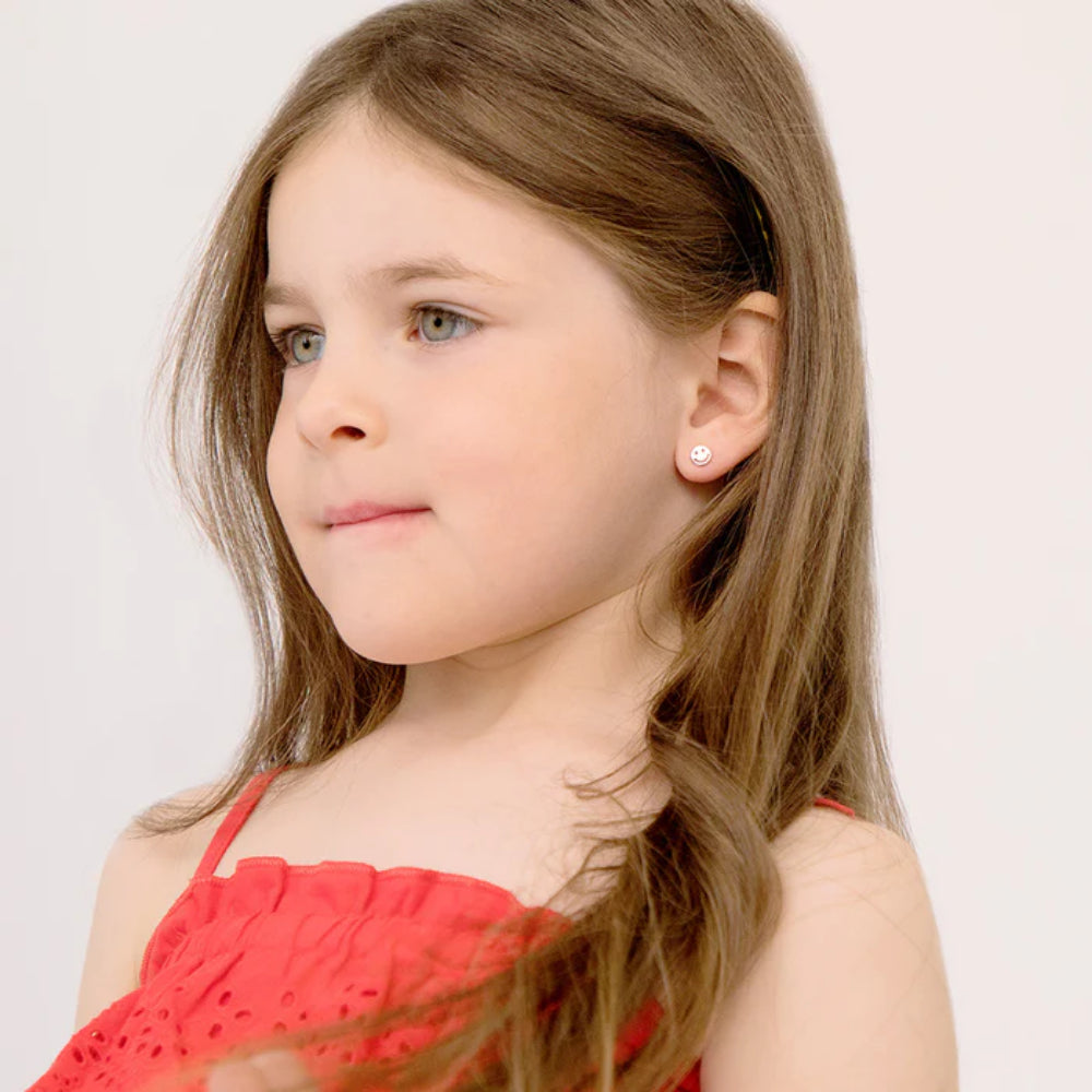 A pair of earrings that will immediately add a smile to your little girls face. These happy earrings feature a fun smiley face that will brighten up any girls day. These beautiful smile earrings include safety screw backs, that allow the earrings to remain safely in place.