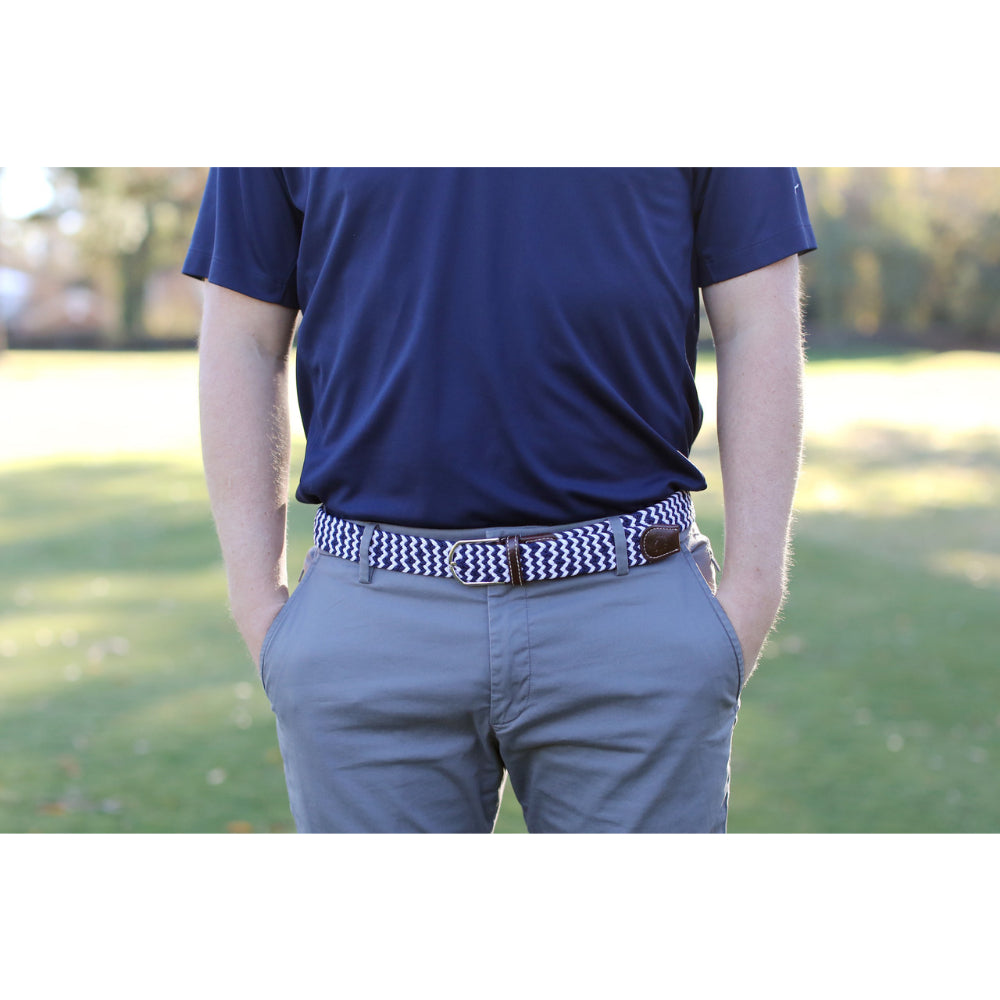 The Cape Cod two-toned braided stretch belt. Classic Navy Blue and White chevron-patterned belt with a silver rounded buckle and dark brown leather finish stamped with the Roostas logo. An adjustable clasp goes through the woven belt, allowing for adaptable sizing. Designed with extra stretch and flexibility.