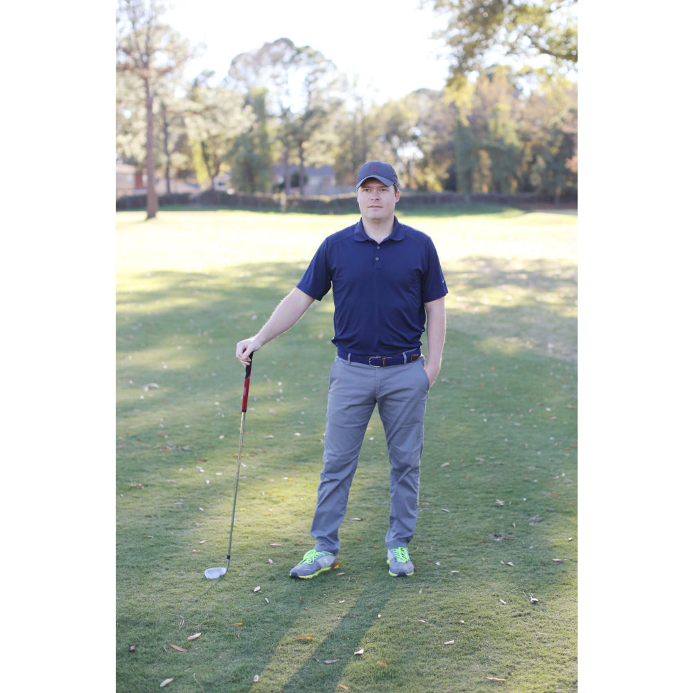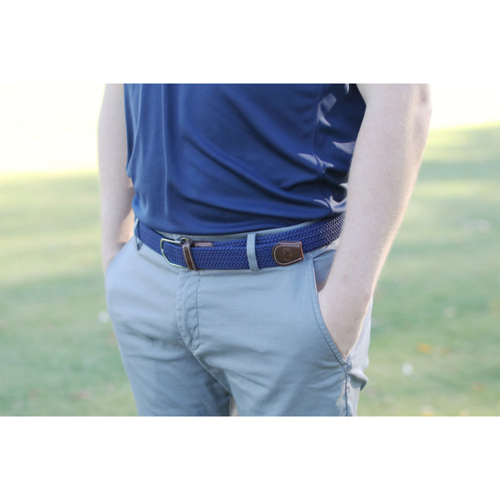 The Pebble Beach braided stretch belt. Navy Belt with a silver rounded buckle and dark brown leather finish stamped with the Roostas logo. An adjustable clasp goes through the woven belt, allowing for adaptable sizing. Designed with extra stretch and flexibility.