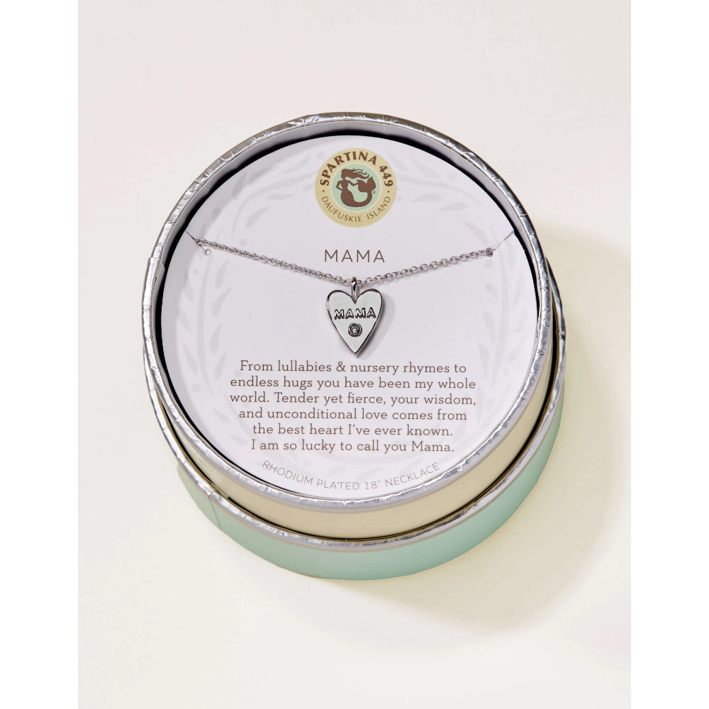 Wear our Mama Necklace as a reminder that Mom is special. Featuring a heart charm pendant engraved with "Mama" and glass crystal gem, this special piece comes packaged inside a beautiful box with the message: "From lullabies & nursery rhymes to endless hugs you have been my whole world. Tender yet fierce, your wisdom, and unconditional love comes from the best heart I’ve ever known. I am so lucky to call you Mama."