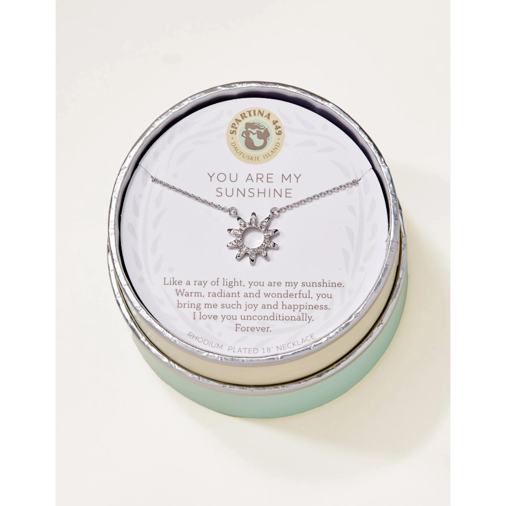 Wear our Sunshine Necklace as a reminder of unconditional love. Featuring a glass crystal studded sunshine charm, this special piece comes packaged inside a beautiful box with the message: "Like a ray of light, you are my sunshine. Warm, radiant and wonderful, you bring me such joy and happiness. I love you unconditionally. Forever."