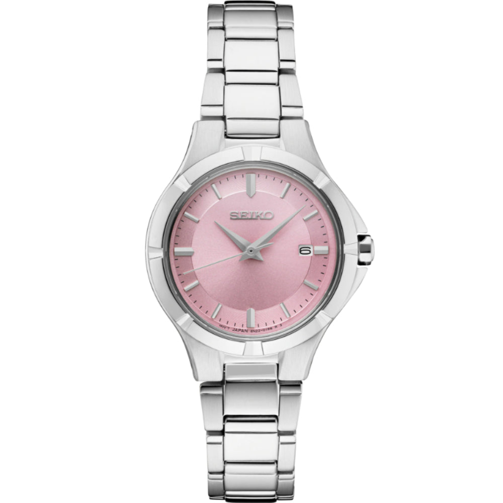From the Essentials Collection. Offering classic designs, the Essentials Collection provides the ideal solution for all-day wear. With precisely sculpted stainless steel case and bracelet, this perfectly minimalist watch features a clean pink sunray dial with silver hands and stick markers, as well as a date calendar, for a superb blend of clarity and style. 10 bar, 100M Water Resistant