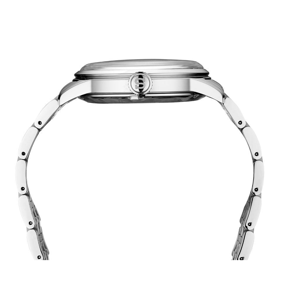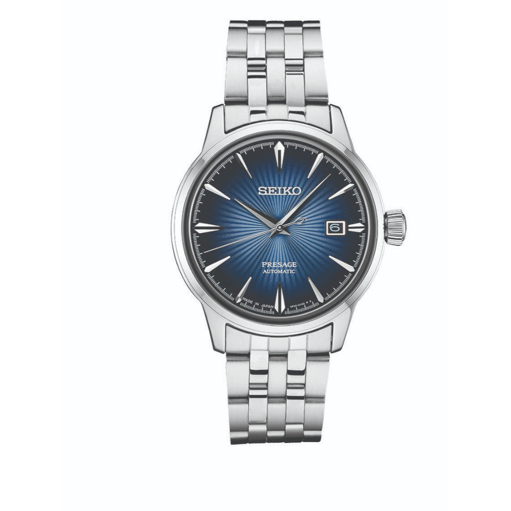 Seiko Presage Automatic. This refined men's watch is designed with a stainless steel case and bracelet. The dial features a blue deep, pressed pattern whose shimmering beauty is enhanced by seven layers of gloss finish and the clarity of the box-shaped crystals. The hands are delicately curved by skilled craftsmen and women to give the watch case a slimmer profile. When turning the uniquely shaped crown, you can feel the strong torque of the winding mechanism. Automatic movement allows self and automatic winding capabilities and features 21,600 vibrations per hour, with a power reserve of approximately 41 hours, as well as 23 jewels. 50M Water Resistant