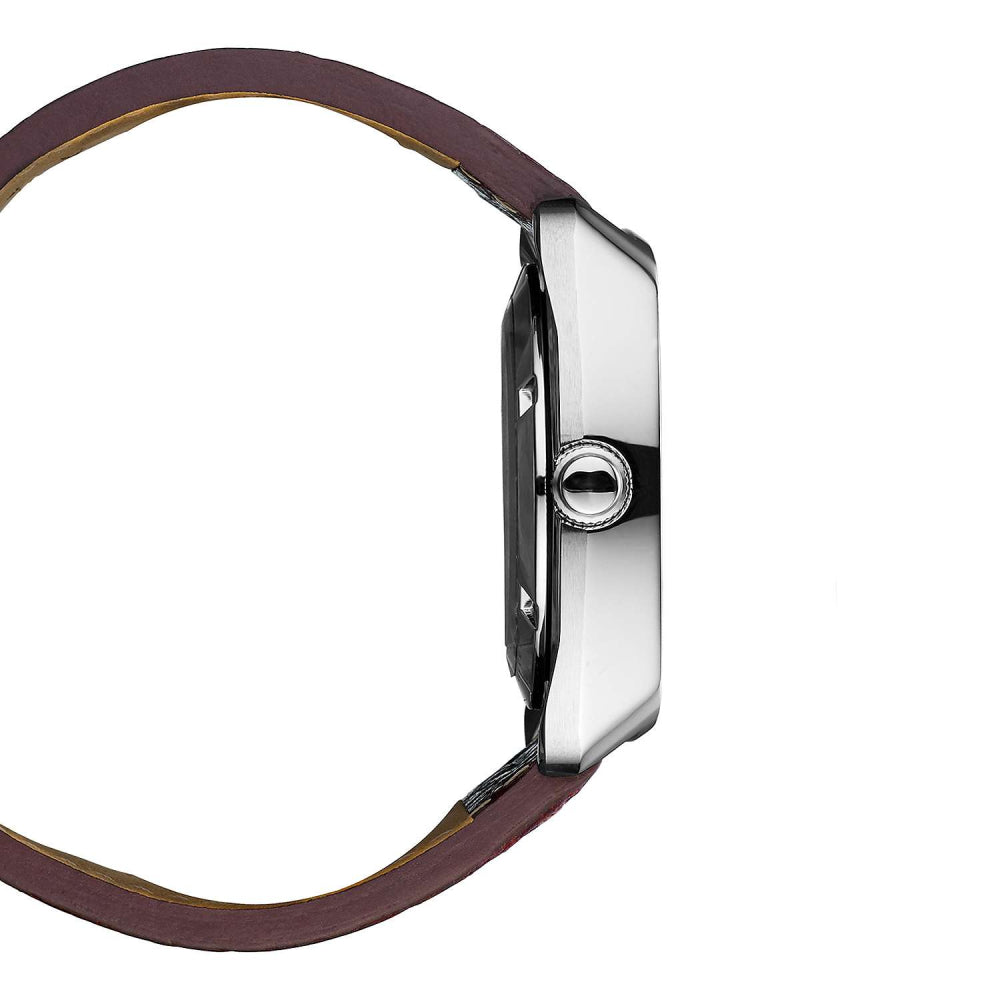 Seiko RECRAFT Series Automatic. This sophisticated men’s watch is designed with a rectangular stainless steel case and brown leather strap, featuring a teal dial and day/date calendar with see-through caseback. Automatic movement allows self and automatic winding capabilities and features 21,600 vibrations per hour, with a power reserve of approximately 41 hours, as well as 21 jewels. 50M Water Resistant