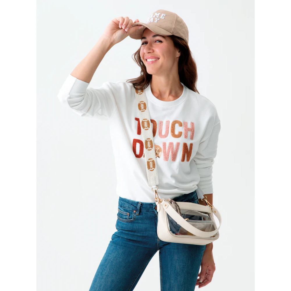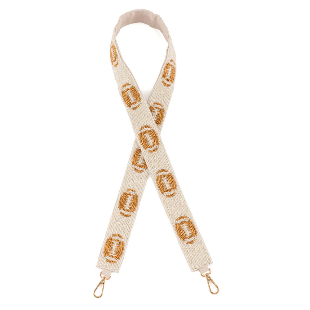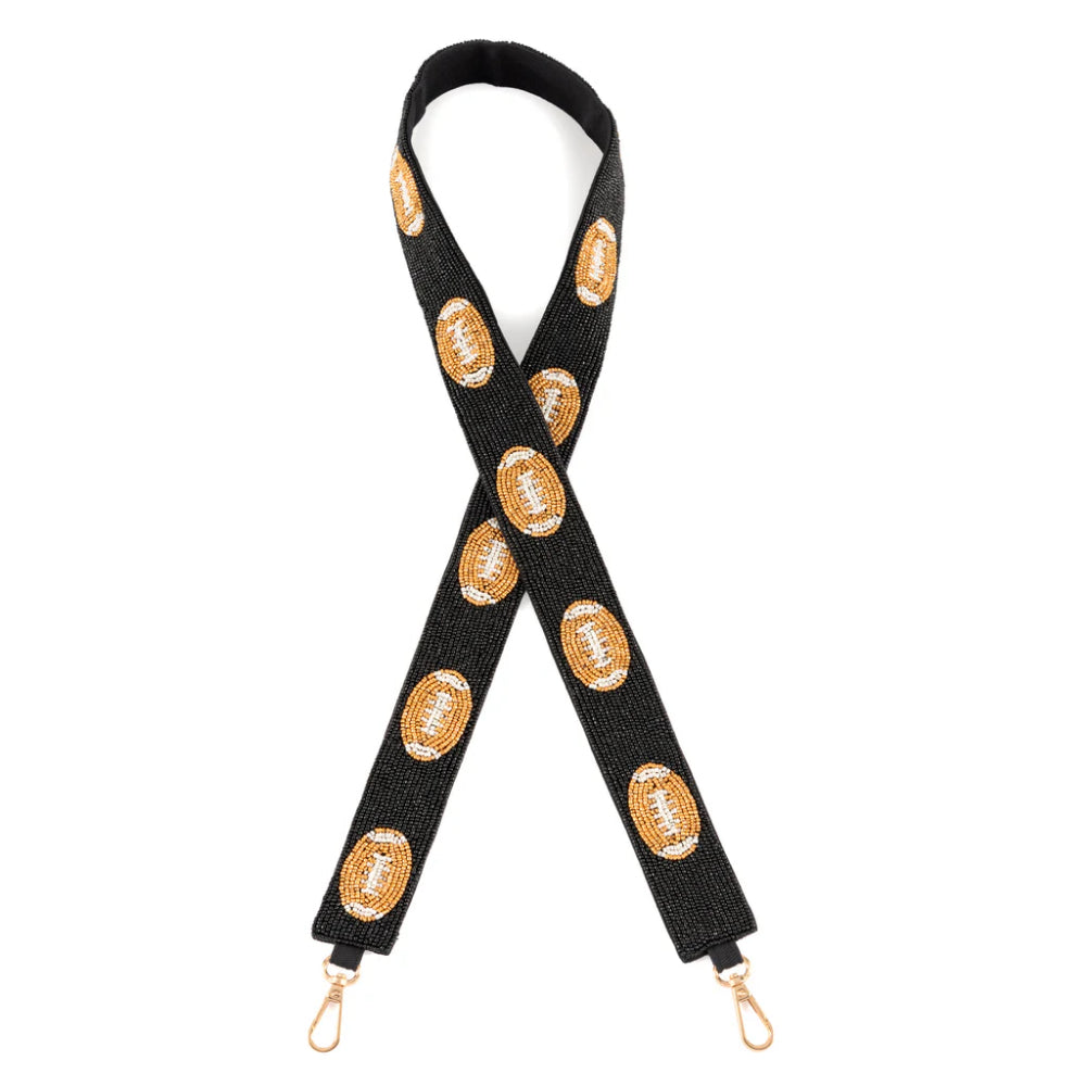 Make any bag match the occasion with the Football Beaded Bag Strap. This adorable handbag accessory is detachable with gold hardware clips on either end of the strap, allowing you to clip it onto the frame of any purse you like. Its trendy and intricate design features a football pattern made from beads.