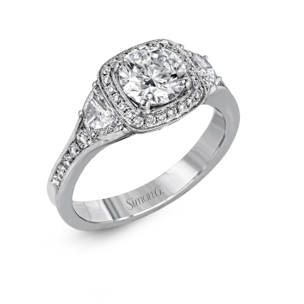 Featuring a lovely contemporary design, this white gold ring is complemented by a halo of 0.28 ct round cut white diamonds and accented with 0.42 ct half moon shaped diamonds.