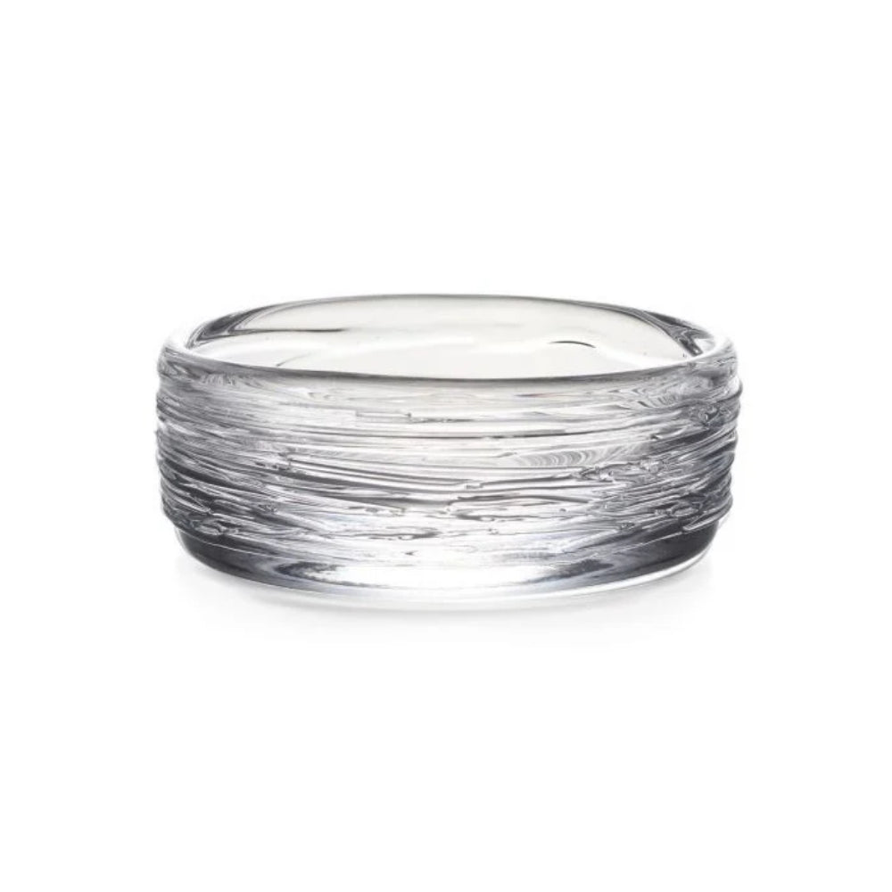 Frozen in winter, flowing in summer – our Echo Lake Collection is inspired by the constantly changing rivers, streams and waterways of Vermont. In a bold interpretation of the craft, master glassblowers nimbly wrap fine strands of glass around the bottom third of a cylindrical silhouette to form the unique, natural texture of this wine coaster.