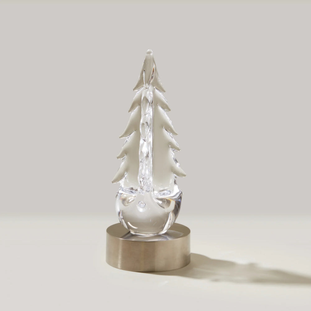 Our handmade glass trees are a signature of the Simon Pearce brand—and a joy to give, collect, and enjoy year after year. This set pairs the 10" Vermont Evergreen with a rechargeable LED base that casts a soft, cool white glow to highlight every branch and bough. Featuring three brightness settings and a timed shut-off—it’s a simple way to bring extra brilliance to your forest.