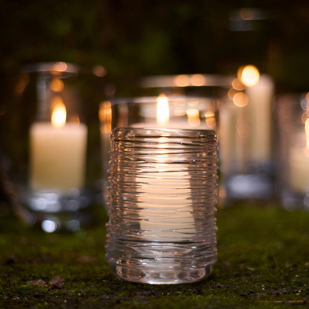 In a bold interpretation of the craft, master glassblowers nimbly wrap fine strands of glass around a cylindrical base to form the unique, natural silhouette of each candle holder. Whether frozen in winter, or flowing in summer - this piece was inspired by the constantly changing rivers, streams and waterways in Vermont.