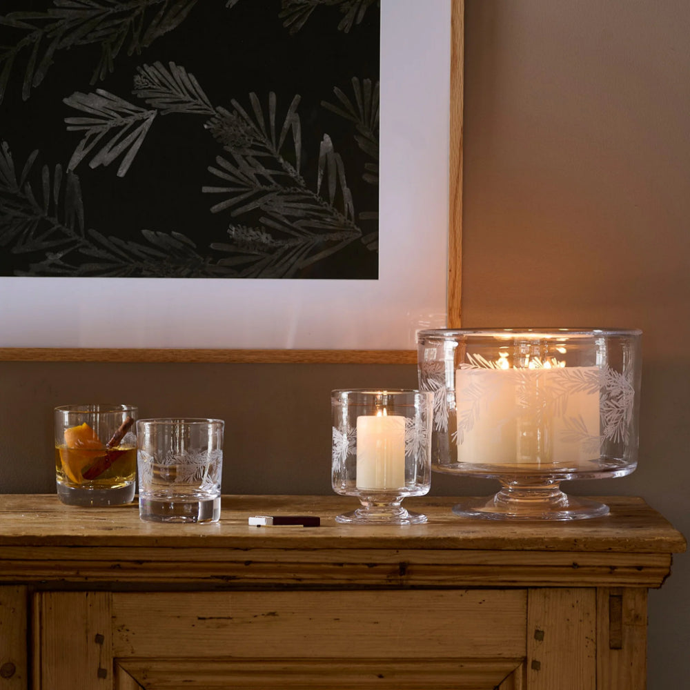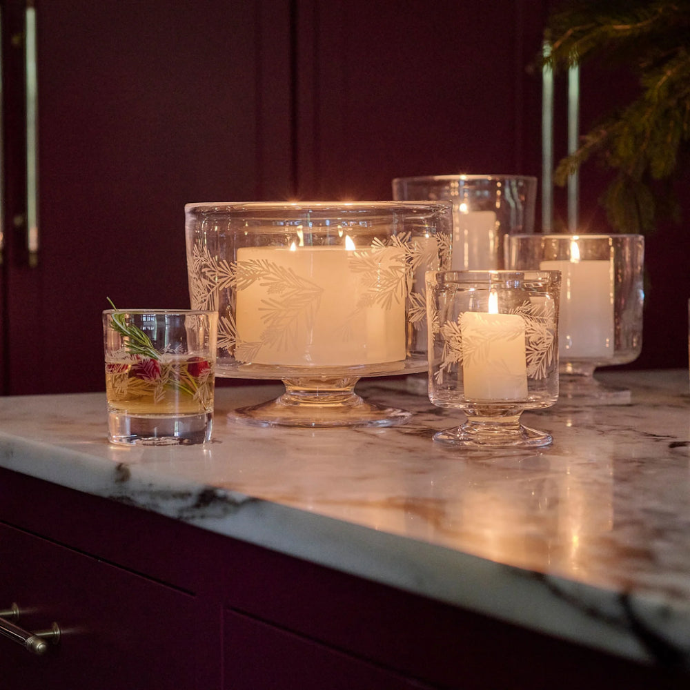 The clean, cylindrical silhouette of our Nantucket Hurricane gets a seasonal update with a delicate pine engraving—bringing a classic winter motif to one of our most loved designs. Inspired by original sketches from our design studio and engraved with fine detail, this piece casts a warm glow that highlights every branch and needle.