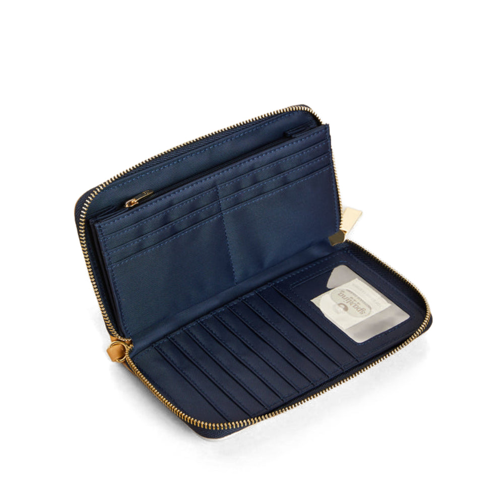 Many of the most favorite features from our most favorite wallets are all in our 449 Wallet! Full-zip security, wallet or wristlet functionality, loads of card slots and room for your phone. Outside you'll find a custom Spartina mermaid stud and bonus back side zipper coin pocket.