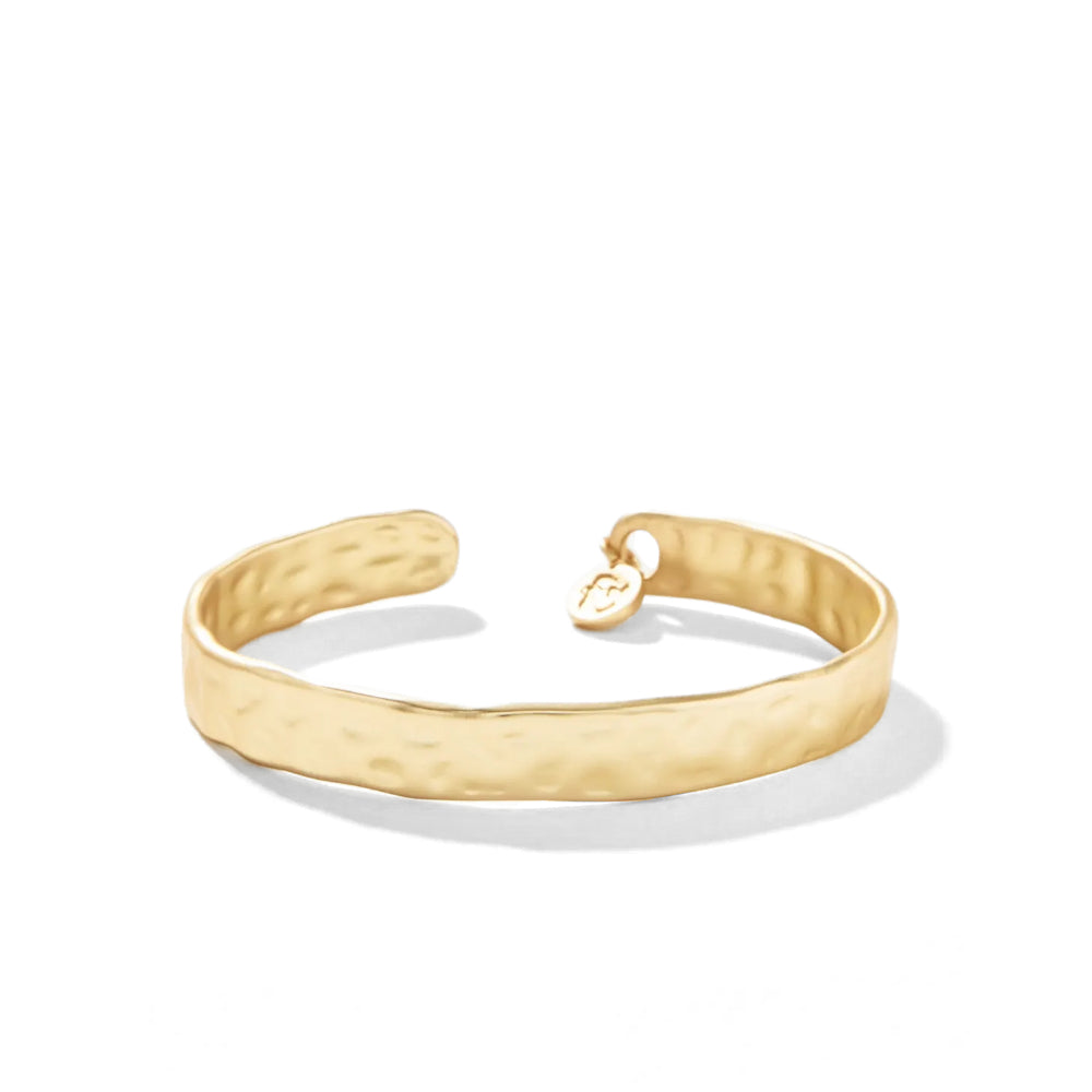 Your Lowcountry style shines through our Hammered Cuff in 18kt matte gold plating with luxe texturing. Gently bend to adjust fit.