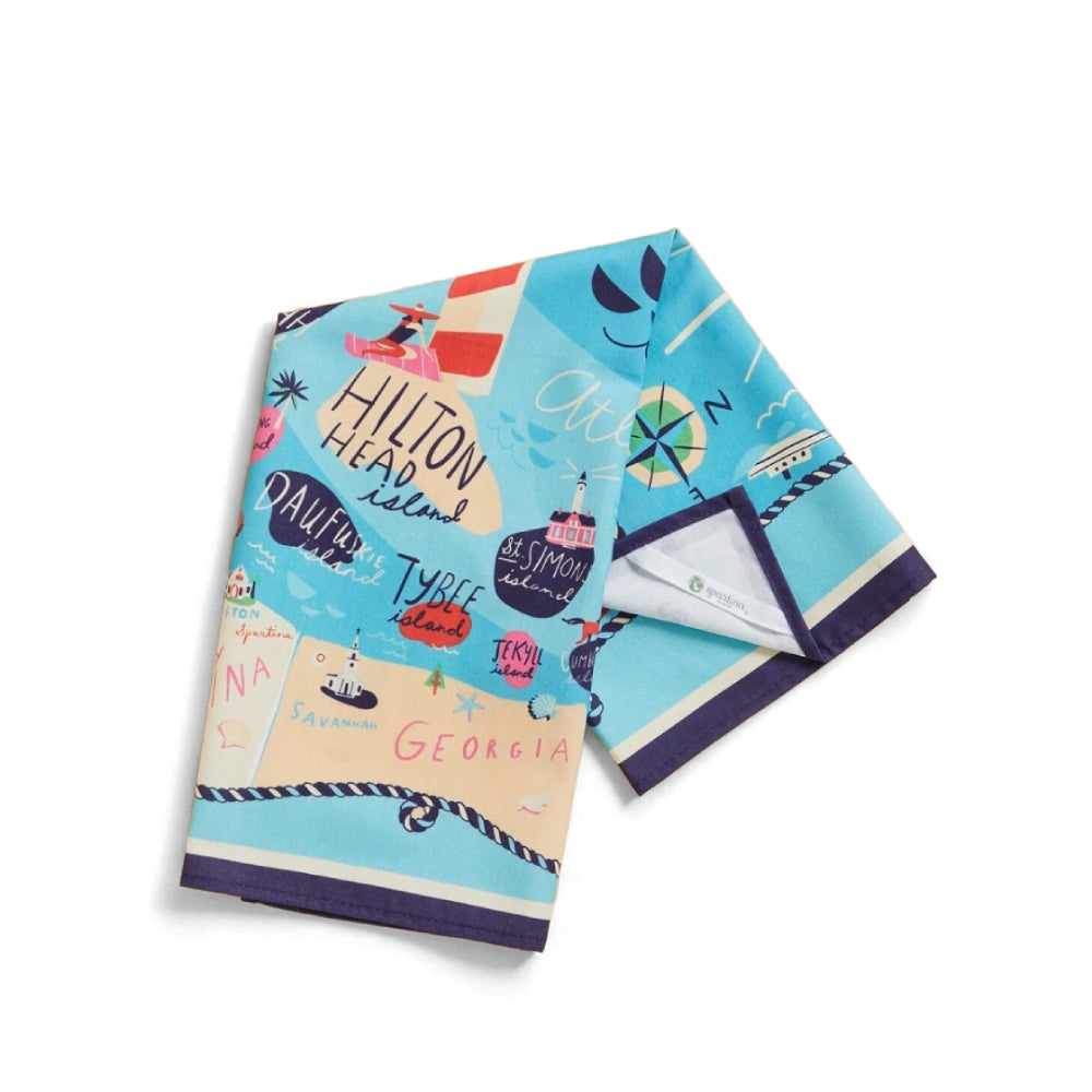 The perfect 100% cotton towel has arrived! Made to serve as a dish towel, tea towel, hand towel, bar towel or guest towel, our whimsical, original map designs add extra joy to your home with happy hues and local illustrations. Pair with a summer charcuterie board or fresh baked bread during the holidays. Pick one up as a souvenir to commemorate a trip or showcase your local pride. No matter how you hang it, this Greetings From Sea Islands Dish Towel is a must have.