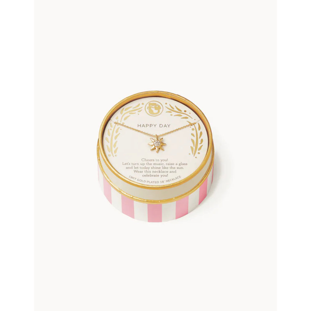 Wear our Happy Day Necklace as a reminder to celebrate you. Featuring a sun charm, this special piece comes packaged inside a beautiful box with the message: "Cheers to you! Let's turn up the music, raise a glass and let today shine like the sun. Wear this necklace and celebrate you!"