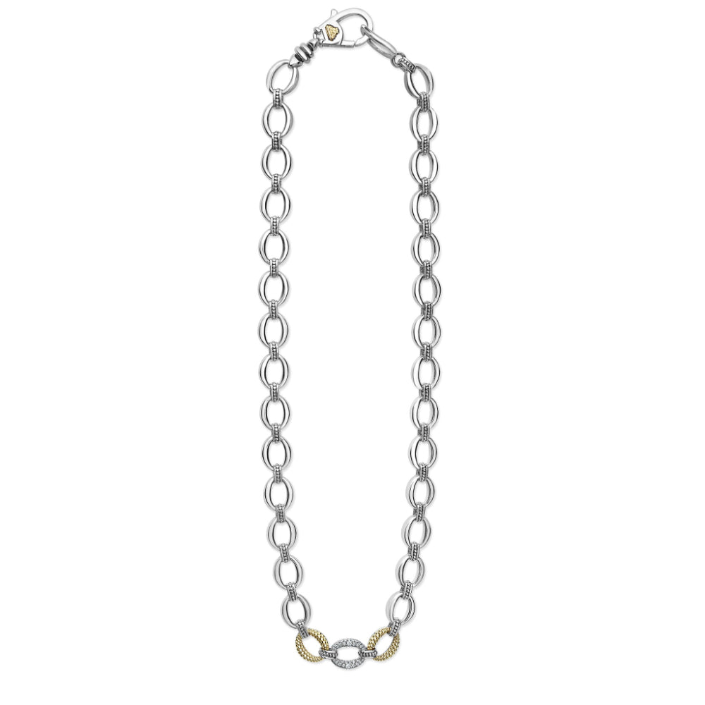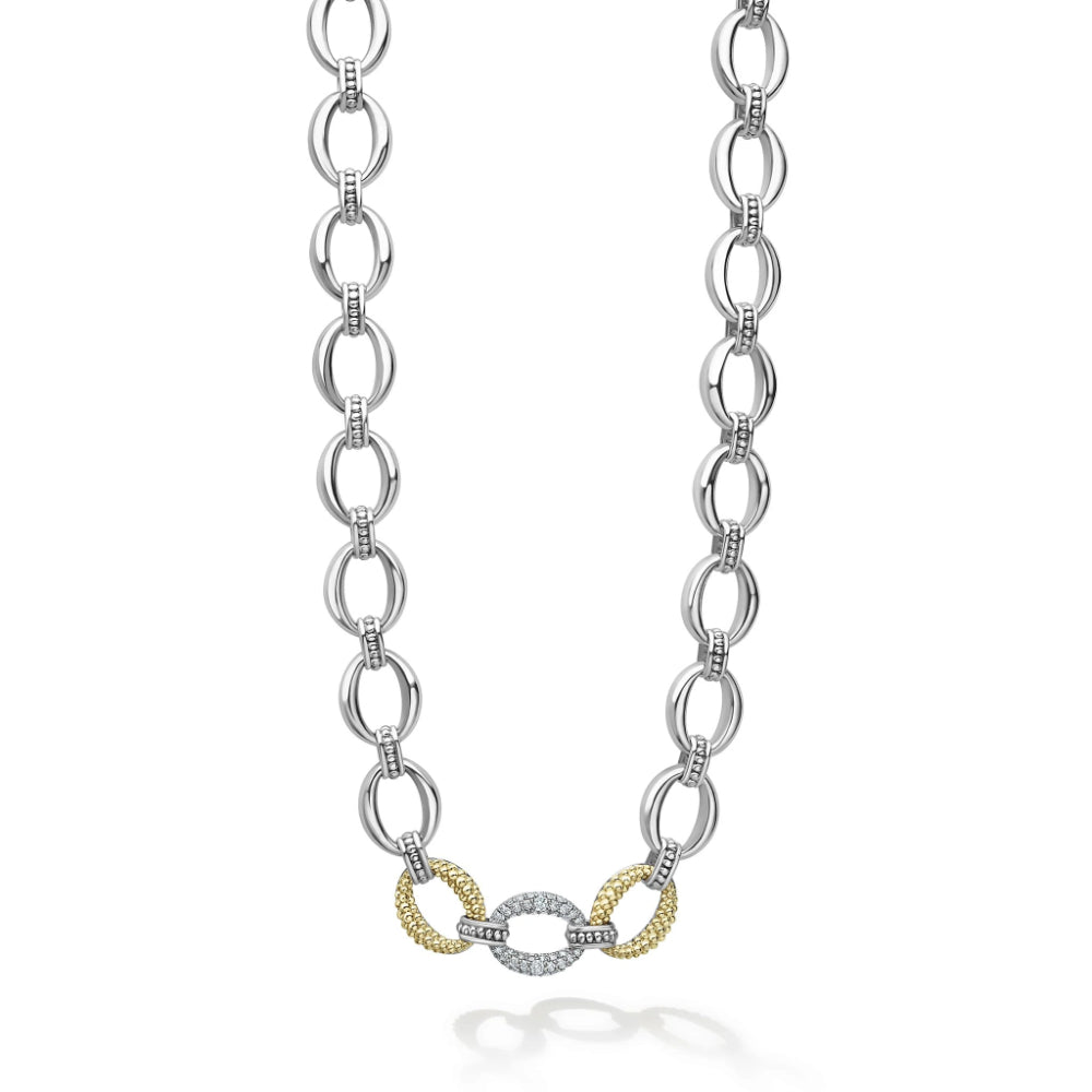 A single pavé diamond link, 18k gold, and sterling silver create this classic link necklace. LAGOS diamonds are the highest quality natural stones.